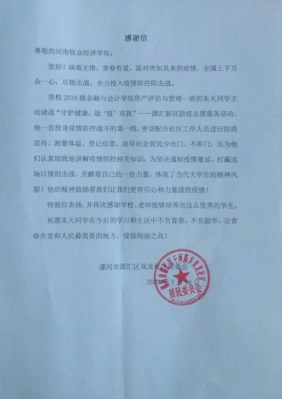 河南省漯河市源汇区双龙社区居委会发来感谢信,对beat365beat365官方网站2018级资产评估与管理一班的朱天同学在家乡疫情防控工作中的表现予以表彰和感谢。