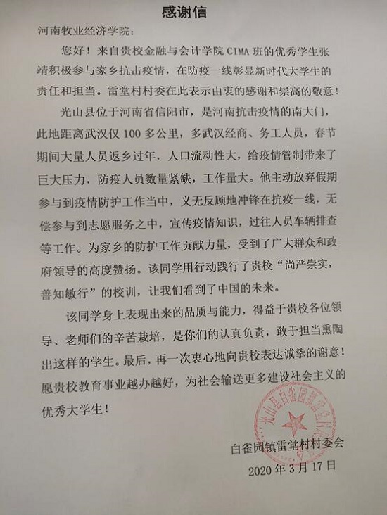 河南省信阳市光山县白雀园镇雷堂村委会特发来感谢信,对beat365beat365官方网站2018级CIMA班的张靖同学在家乡疫情防控工作中的突出贡献予以表彰和感谢。