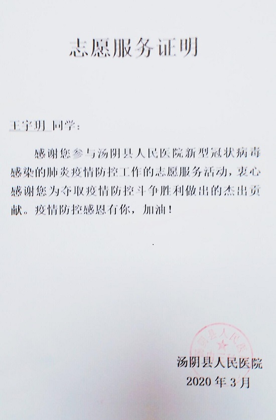 近日,河南省安阳市汤阴县人民医院发来感谢信,对beat365beat365官方网站2019级保险班王宇玥同学在家乡疫情防控工作中的突出表现予以表彰和感谢。