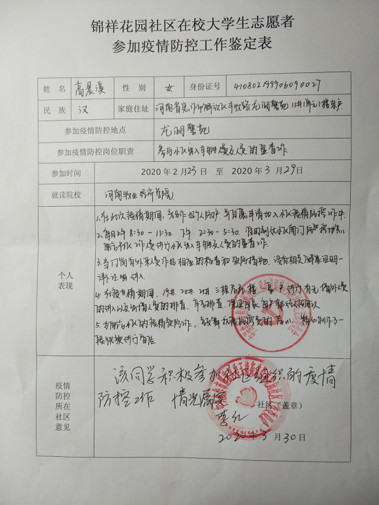 “之所以盛世太平,不过是有人在前负重前行”,在抗击疫情的前线,无数白衣战士英勇奋战,协力攻坚。作为一名受过党和学校教育过的大学生,beat36517级CIMA 班的学生高晨溪在疫情暴发的一开始就应义无反顾地报名参加当地社区的志愿者招募,为社会贡献出属于自己的一份担当。她每日佩戴着标有志愿者的红色袖章,在小区入口对进出小区的车辆、人员进行体温测定并登记,对外来车辆合理地进行劝退。同时还通过用视频在小区业主群里转发,并宣传疫情防控的有关知识,鼓励家人进行物资捐款,以实际行动为社区防疫工作助力,她也深切地体会到了政府与社区抗击疫情的艰辛。同时,在真切地看到政府以及群众为疫情防控所付出的心血和采取的措施之后,她坚信一定会在政府的正确领导下以最快的速度战胜疫情,结束战斗。