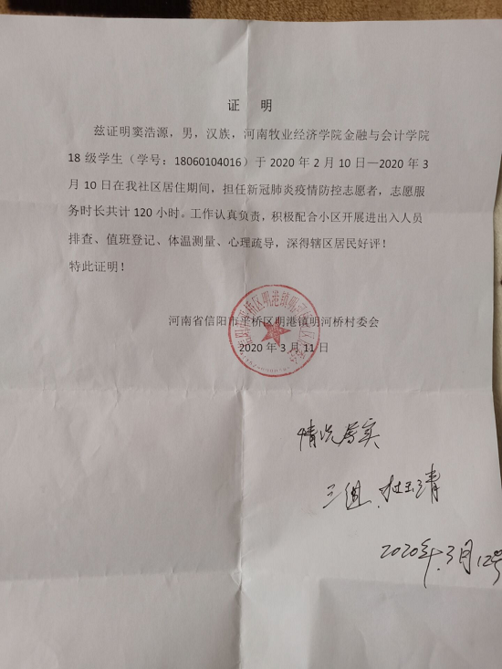 beat36518级投资四班学生窦源浩非常荣幸的成为了一名村民志愿者,为村里进行疫情防控工作贡献出自己的一份力量。起初他只是单纯的想要做这件事,但到后来,他才明白他这个决定是多么正确,因为身为当代大学生,他们应该在国家有难之时挺身而出,为国家奉献出自己的一份绵薄之力。作为共青团员的他,应该尽好自己身为团员的责任,积极为村里疫情防控工作奉献自己的力量。在这段志愿者工作期间,虽然很辛苦,但是他从中学到了很多,责任之大重于泰山,因此他必须严格检查进行防护,对进出人员进行排查、值班登记以及体温测量,避免任何一个可能携带或患有新型冠状肺炎的人进入村子,这样才能保障村民的人身安全。