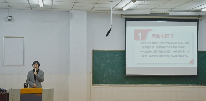 讲座伊始,李老师对当代大学生面临的严峻的社会就业形势进行了详细和深刻的剖析,并通过丰富的图片和视频宣讲的方式向参会毕业生介绍就业途径、方式以及公司发展历史。接着,李老师对大学生毕业后可选择的道路提出了问题,参会同学积极发言,她就同学们所关心的问题进行耐心的解答。最后,李老师详细地阐释了毕业生就业之前需要签办的各种章程以及所需要注意的各种事项,对毕业生制作简历和面试技巧方面进行了耐心地指导。