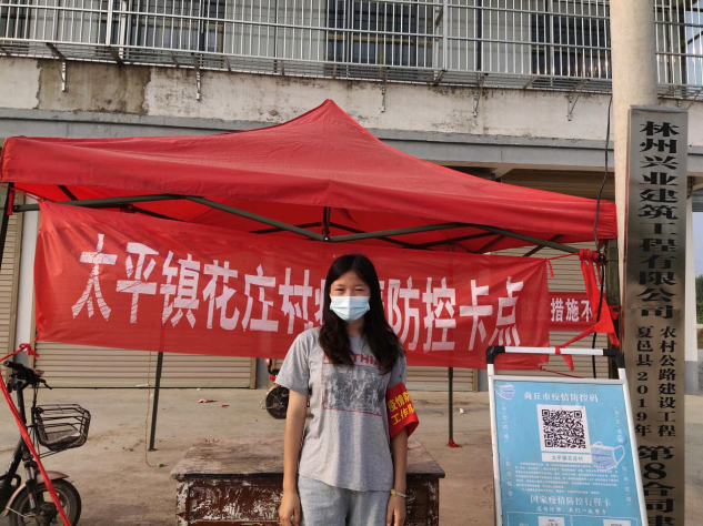 在疫情防控的关键时刻,程怡静同学挺身而出,成为一名志愿者,在行动中坚守初心,勇担使命。在8月17日到8月28日这段时间她主要检查来往车辆,测量体温登记进出人员身份信息,确保进出门群众都为健康码正常体温正常的人员。作为一名当代大学生,她虽然只是做了一些不能再小的小事了,但这点小事筑起了一道牢固的安全屏障。
