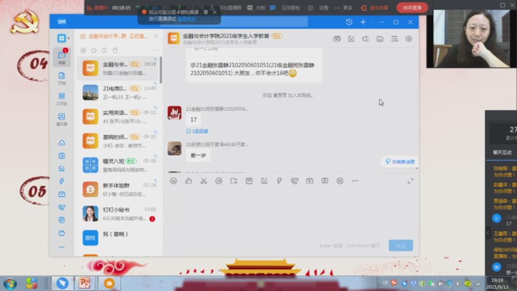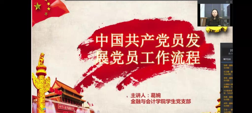 为使新生了解中国共产党党员发展流程,引导新生端正入党动机,提高对党的思想认识,9月13日晚7点,beat365官方网站组织开展了一场以“中国共产党党员发展流程”为主题的新生入学教育专题讲座,由葛婉老师进行线上直播。