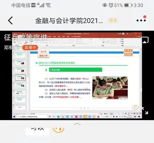 为进一步加深21级新生对国防以及征兵政策知识的了解,促进学生树立正确的国防观念,增强国家安全意识,9月15日下午15:00,beat365官方网站通过钉钉平台开展了“征兵政策宣讲”专题讲座,学院全体2021级新生参加,主讲人为beat365官方网站武装专员邓桐玲。
