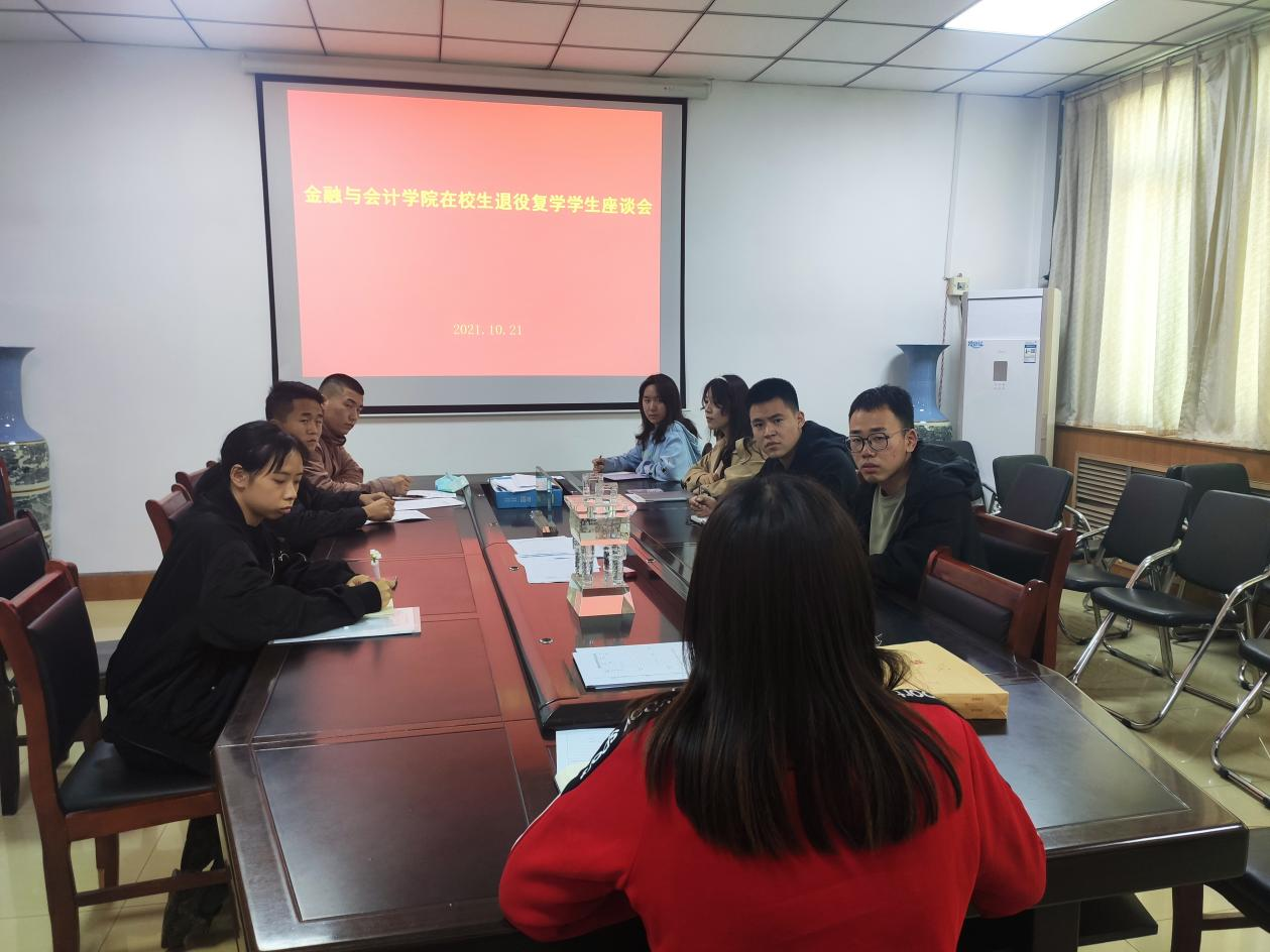 会上,邓桐玲老师首先请参与座谈会的各位学生分别发言,退伍学生代表结合自身实际,分享了在部队两年的经历、体会和收获。他们表示两年的军旅生涯是人生一次宝贵的成长经历,开阔了视野,锻炼了毅力,培养了责任和担当,是人生一笔宝贵的财富。随后邓老师向同学们宣讲了国家、学校有关退伍复学同学的相关政策,也一一的交流了解退伍同学复学后在学习生活状况适应性如何,课程能否跟的上,遇到困难及时跟老师反馈。希望通过老师和同学的共同努力,尽快顺利融入校园生活,开启新的篇章。最后,邓老师号召全体退伍复学同学能够保持和坚持军队的好作风、好习惯,在学生群体中发挥先锋模范作用;同时也要在日常学习和生活中为学校国防教育、征兵工作多作贡献。