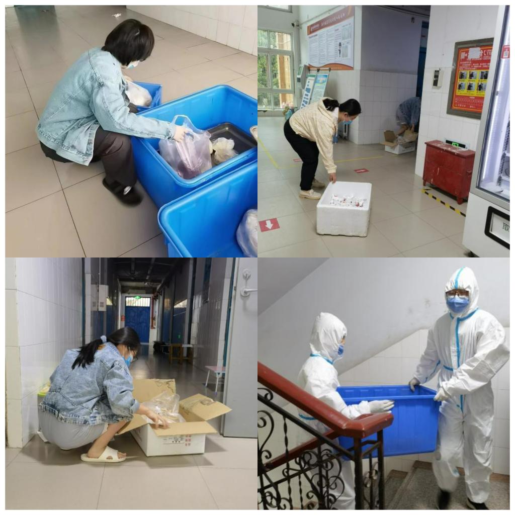 中午12点,9号楼开始了核酸检测。刚送完餐的老师们顾不上喝口水休息一下,就开始穿上闷热的隔离服,核酸检测扫码、维持2米间距、挨个敲门下楼核酸检测。