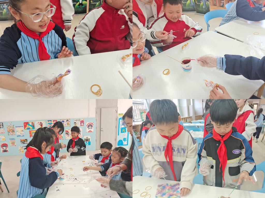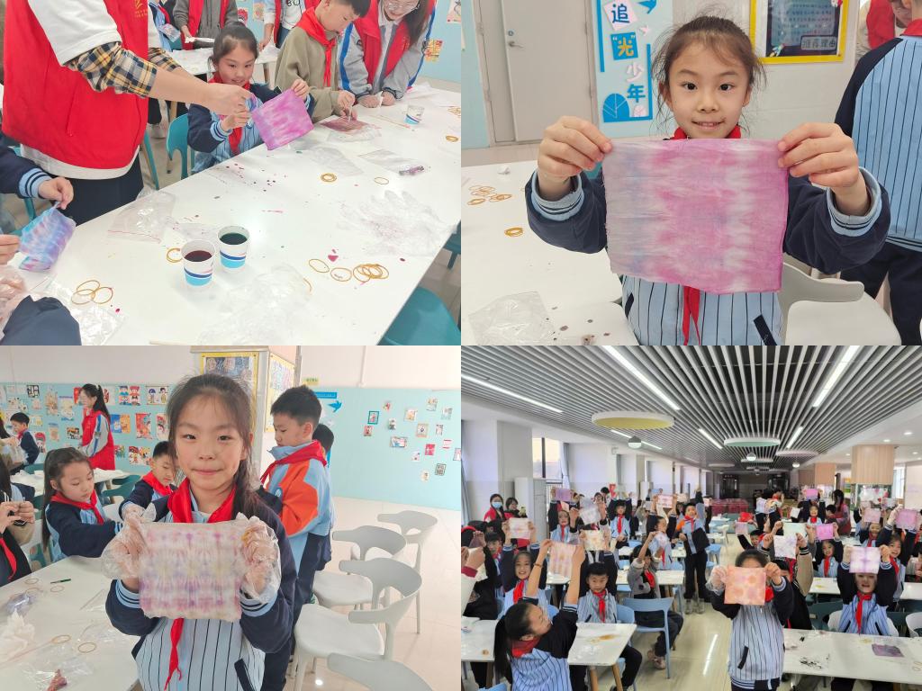 接着,通过分组,志愿者帮助小朋友们用颜料和滴管在染布上“作画”,每个小朋友都有独特的见解,他们不同的想法也一一展现在染布上。通过不同的调色以及各种颜色的混合,染布也变得多姿多彩了。