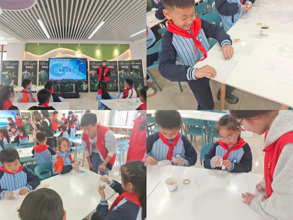 恰逢阳春三月,春暖花开,两个协会带领25名青年志愿者来到了郑州师范学院第二附属小学。活动开始,首先由志愿者为小朋友们讲解非遗扎染工艺,介绍了扎染作为中国传统的文化艺术,在日常生活中也发挥了重要的作用,小朋友们都认真听讲,表现出极大的兴趣。