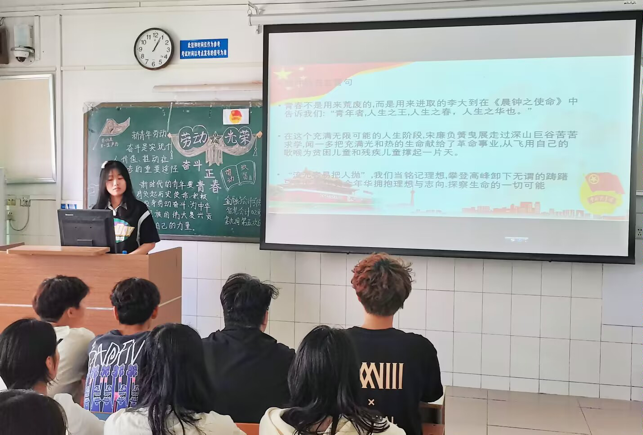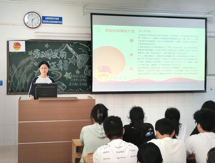 伴随着嘹亮的团歌声,各班团课活动有序展开。首先,各班团支书向同学们介绍了劳动的重要性,让同学们明白劳动的价值和意义。接着,团支书向同学们分享了王进喜、时传祥等劳动模范的故事,让同学们更好地了解到劳动模范的卓越成就。最后,各班团支书号召所有同学们,要树立正确的劳动价值观,积极传承和弘扬劳模精神、劳动精神、工匠精神,热爱劳动,热爱奋斗。