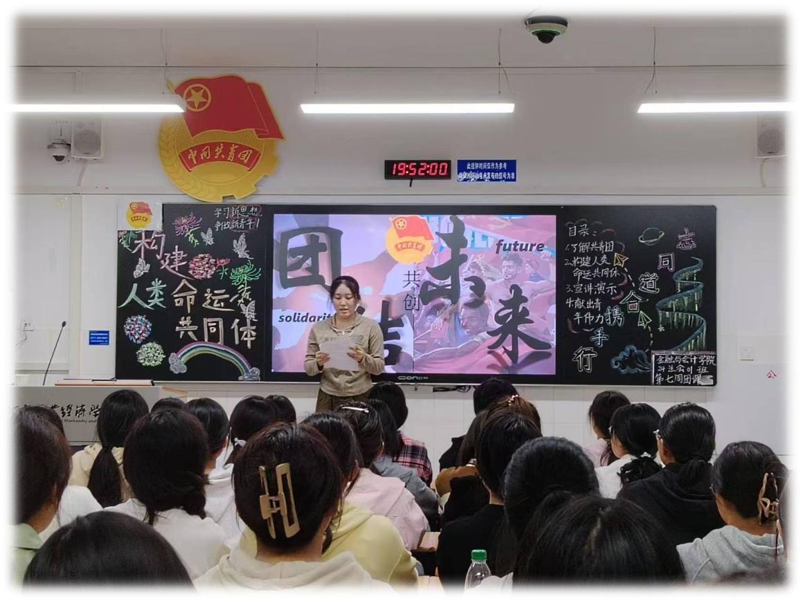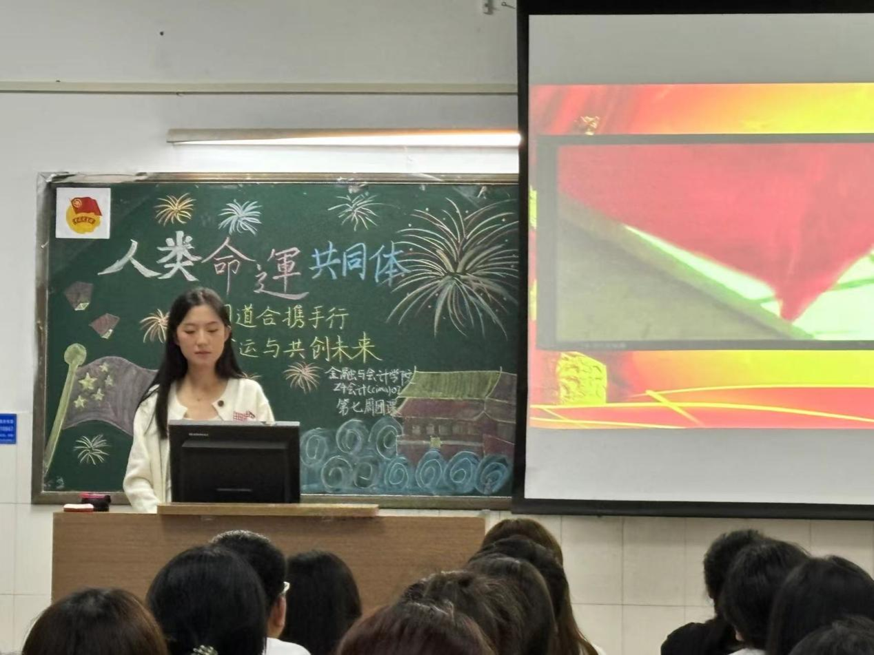 伴随着嘹亮的团歌声,各班级的团课活动有序展开。首先,团支书组织同学们对“世界怎么了?我们怎么办?”的时代之问进行探讨和回答。接着,团支书邀请同学进行主题演讲,并以青年如何践行人类命运共同体为题进行了发言,通过典型事例鼓励广大团员和青年坚持胸怀天下,关注民族命运、国家命运和地球命运。最后,通过观看相关视频,同学们更加深刻理解人类命运共同体的内涵与意义。