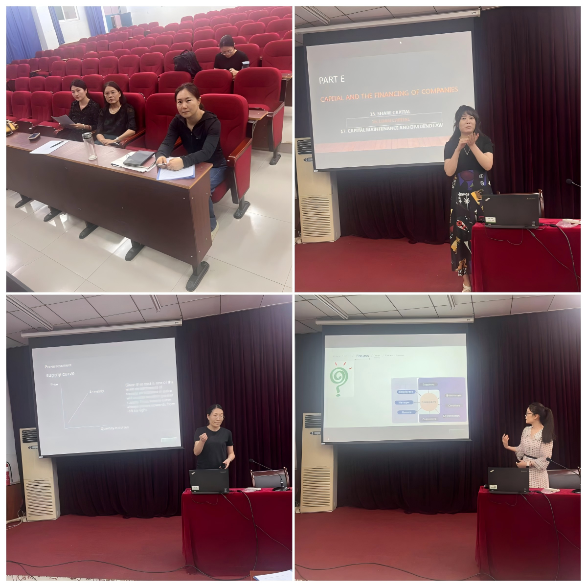 来自财务管理、审计学、金融学、会计学教研室的汪萍,刘翠,蔡兆瑞,张馨月,樊路青5名教师参加了试讲,涉及的课程有《Business &Technology》、《Corporate and business Law》、《管理会计[P1]》、《Fundamentals of Ethics, Corporate Government and Business Law》、《Fundamentals of Economics for Business》共5门。副院长崔海红、决策与规划教研室主任苏欣,国际会计教研室主任李敏敏3位经验丰富的教师担任了评审专家。