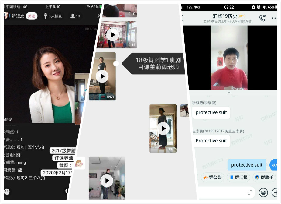 课前进入了班级群,提前上传了视频、课件,作业,通过学习通和QQ群提醒学生上课时间,提前演练了学习通的互动功能。由于出现了网络卡顿,及时改用视频录播+语音群通话的备用方式进行教学,顺利完成了教学。互动情况良好,学生能够根据提问积极作答,并且有学生提出问题。在讨论环节,我设置题目并通过例子提示,学生能够给出更多例子来论证自己的观点。 ——《现代汉语(二)》课教师马文津