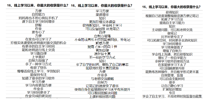 从学生反馈来看,多数学生对于线上教学整体比较认可,认为提高了自己的学习主动性以及自主学习的能力,让自己更加自律;线上学习可以反复回放老师的教学视频,学习更方便;接触到了更多样化的学习途径与更丰富的学习资源等等;同时也表达了对与实体课堂的怀念。