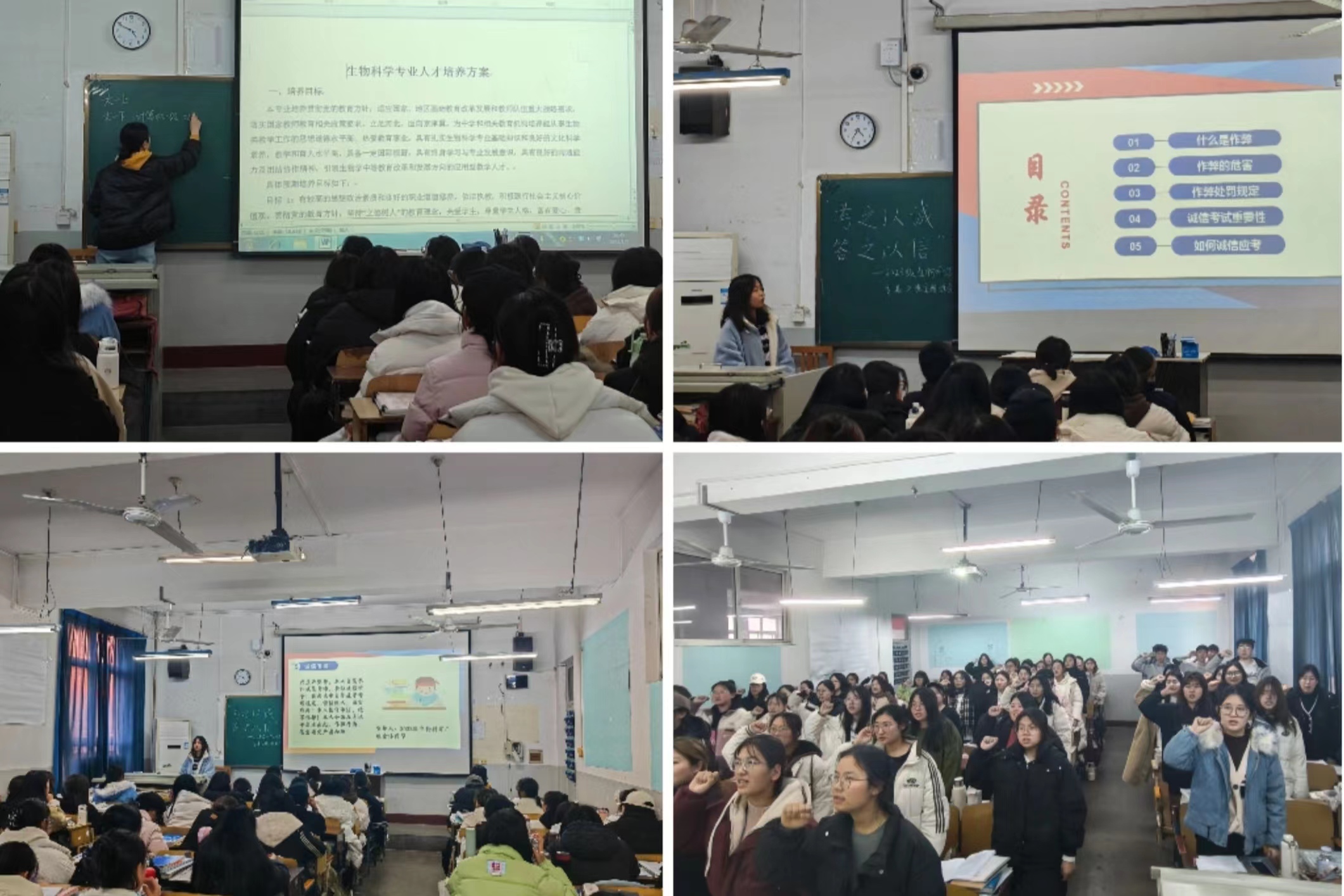 为了加强班级成员的诚信教育,提高学生的道德素质和考试诚信意识,2023级生物科学2班于2024年1月2日在第二教学楼312教室召开了诚信应考班会。此次班会由学习委员曹慧主持开展,诚邀辅导员赵春红老师进行指导,全体同学参加了此次班会。 会议伊始,学习委员曹慧首先强调了诚信应考的重要性,指出考试作弊不仅违反了学校的规章制度,也会影响到自己的学业和未来的发展。她通过案例分析,向同学们介绍了一些常见的考试作弊行为及其后果,提醒同学们要严格遵守考试纪律。随后,同学们就如何做到诚信应考进行了深入的讨论。大家纷纷表示,要认真复习,积极备考严格遵守考试纪律,以自己的真实水平应对考试,做一个有道德、有担当的大学生。紧接着,由班长王永志带领大家进行了诚信应考宣誓,并组织大家有序签下自己的名字。最后,由赵春红老师对此次班会进行了总结,并向同学们介绍了大学各个阶段需要考取的证书,她强调诚信是立身之本,是大学生应该具备的基本品质。希望同学们能够将诚信应考的意识内化于心、外化于行,做到诚信考试、诚信做人。