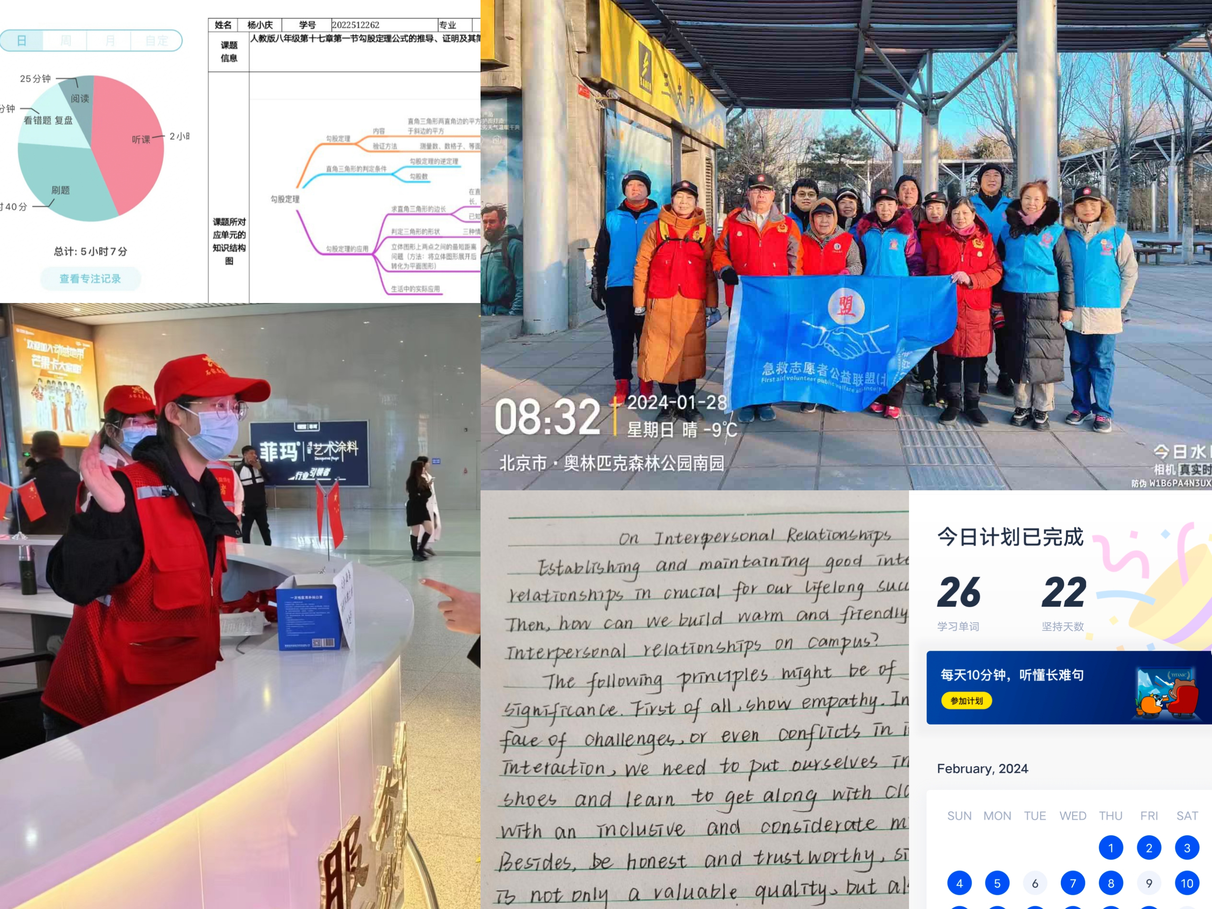 为做好寒假承前启后的关键作用,针对性、高效性、多样性的促进学生综合素质提升,2022级数学与应用数学2班积极开展寒假提升计划,复盘与规划并重,学业与实践并行。 本次寒假提升计划时长共计四周,围绕社会实践、自律打卡、师范技能三方面展开,同学们事事认真、件件落实。实地考察社会热点问题中,同学们结合数学专业特色制作了数据统计与分析,切实体会到“学以致用”;学业规划活动中,同学们复盘与规划并重,搭建好两个学期之间的“桥梁”;教案设计、录制微课,不仅训练了师范生技能,更让同学们对教师工作有了不一样的“初体验”。