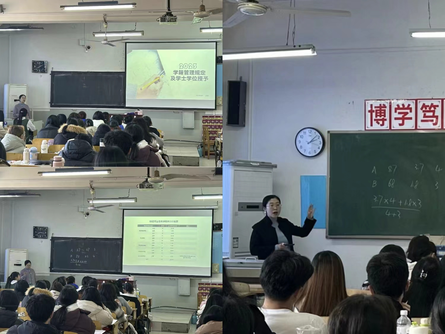 为帮助学生全面了解学校学籍学位管理相关条例,明确专业学习目标和任务,促进学生更好地适应融入大学的培养教育模式,辅导员徐倩老师分别于3月7日下午、3月8日上午、3月15日下午组织2023级数学与应用数学1班、2023级物理1班、2023级数学与应用数学2班的同学们召开了“2023学籍管理规定及学士学位授予”主题班会。 会议伊始,徐倩老师首先强调了学籍学位管理相关条例对同学们课程学习、考核、毕业以及学位授予的重要性。她从学士学位授予细则、课程设置及要求、学籍管理规定以及关于取消清考和重修四个部分进行了讲述。第一部分,她带领同学们分析了学分制教学管理规定,在黑板上通过举例说明的方法向大家介绍了各项学分绩点的计算方法,强调了绩点的重要性,提醒同学们要合理规划学业任务。第二部分,她讲述了大学四年的课程设置及要求,提升了同学们对于学分制教学模式的认知。第三部分,她从考核与记录记载、毕业结业与学位、补考与缓考以及退学四个方面展开了讲解。第四部分,她为同学们讲解了取消清考和重修的重要内容,强调了课程学习与诚信应考的重要性,鼓励同学们刻苦认真地完成学业,避免课程补考和重修。最后,徐老师为我们展示了她为我们制定的大学四年的考级考证的计划,表示希望同学们脚踏实地,一步一个脚印地前进。