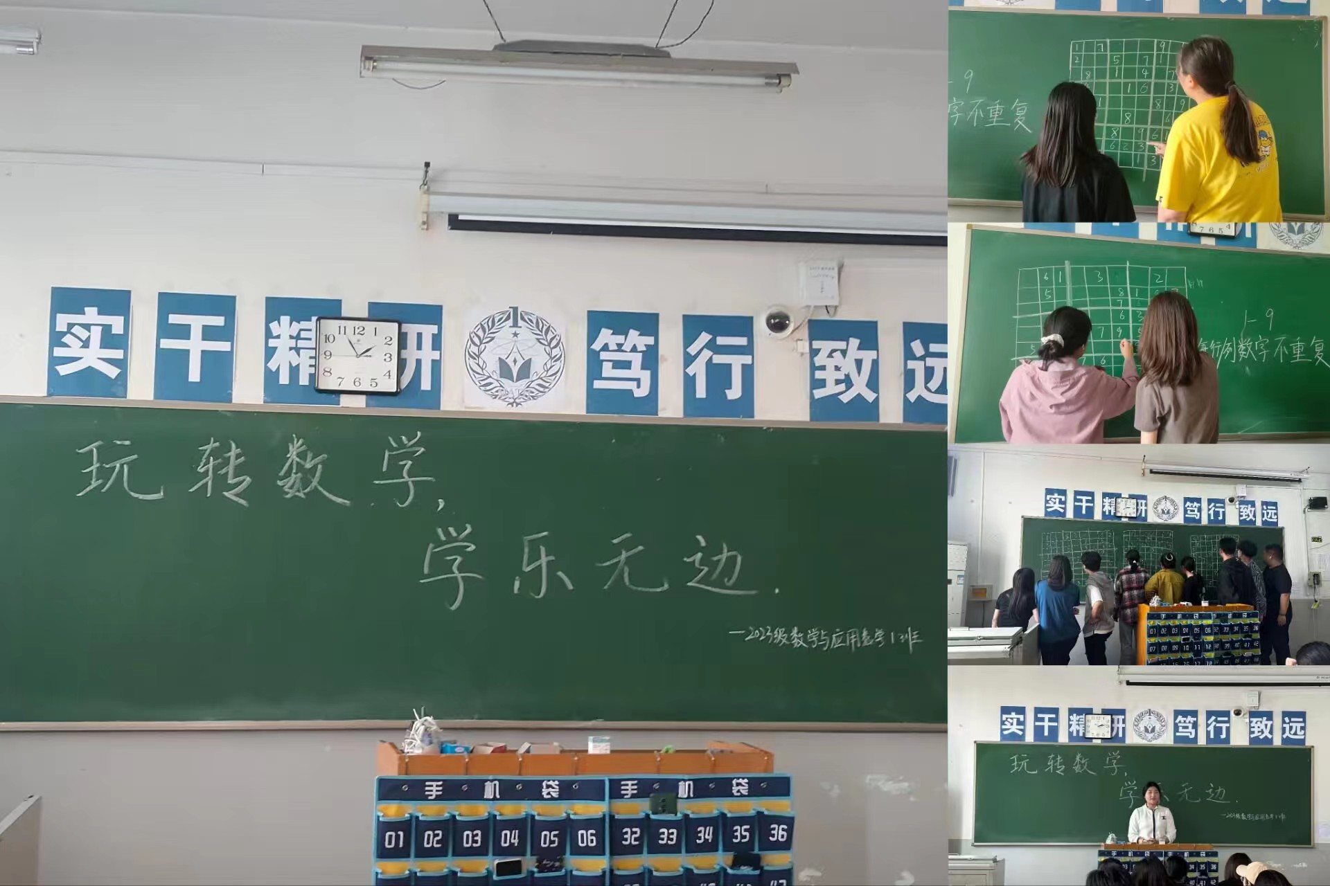 为进一步搭建数学学习平台,培养同学们学习数学的兴趣,充分挖掘同学们的潜能,提高同学们的素养,营造热爱数学、钻研数学的班级文化氛围,培养学习方面的创新能力,2023级数学与应用数学1班于2024年4月11日在二教401教室举办了“玩转数学,学乐无边”的趣味活动。 此次趣味活动由两个数学游戏组成,逢七必过和数独游戏。逢七必过游戏通过让同学们在轮流报数过程中跳过7的倍数,考验了同学们的反应能力和计算能力。在这一游戏中,同学们全身心投入,反应迅速,准确率高。沉浸式的数独活动也吸引了很多同学们。在学委林清晨、生活委兼心理委崔佳宇和组宣委周佳怡在黑板上写完数独题目后,大家争先抢后的跑上讲台,快速的拿起粉笔,细细与数字交锋。在数独的世界中,同学们通过对数字进行筛选、推理、判断,找出合乎规律的答案,提升了观察能力和逻辑推理能力,从而提高了数学学科素养。