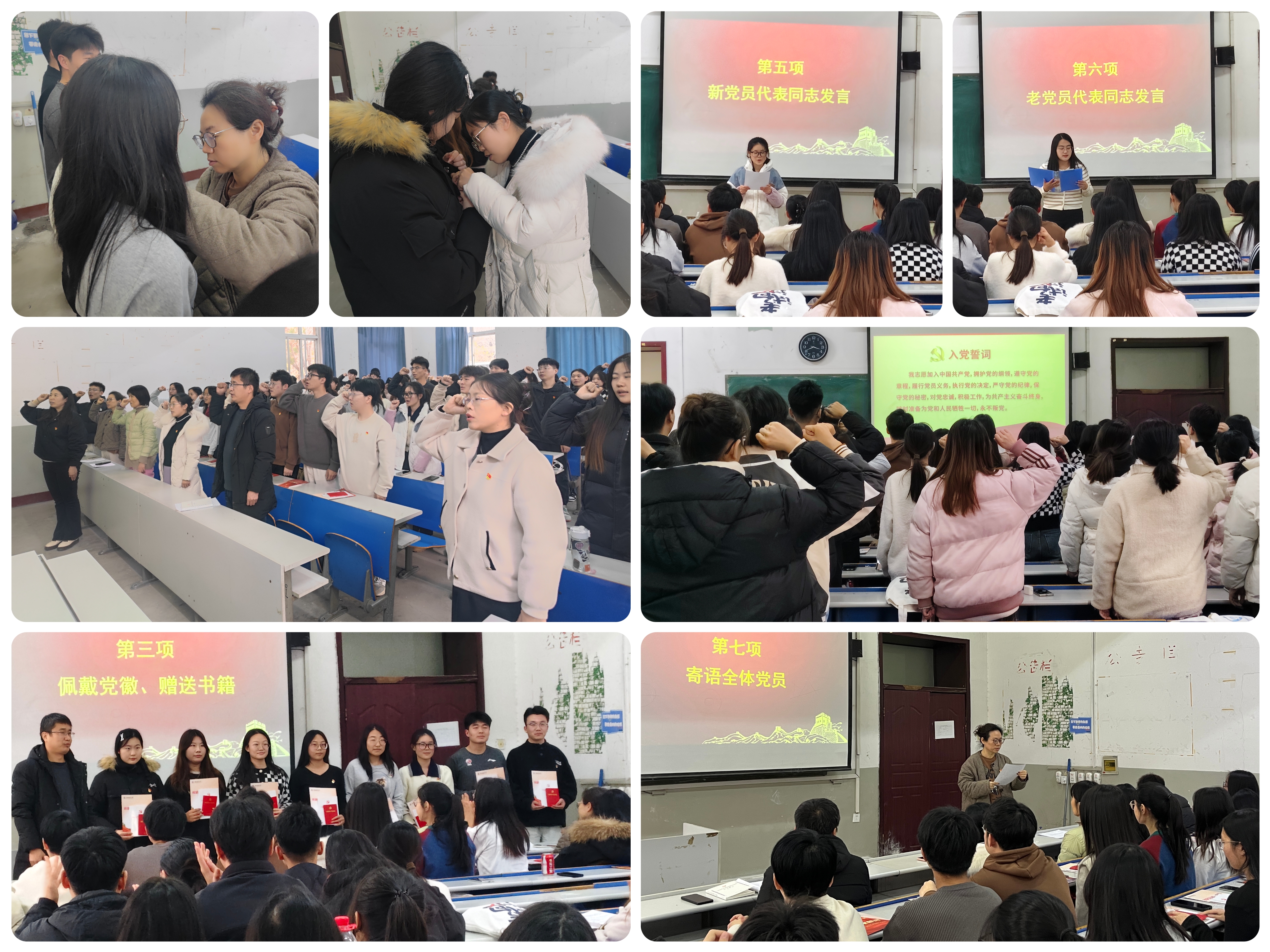 12月12日下午,理学部党总支在第二教学楼111教室举行新发展党员入党宣誓仪式。理学部党总支委员、学生党支部书记、辅导员及全体学生党员参加了宣誓仪式。 大会在庄严的《国际歌》声中拉开序幕。老党员为16名新党员佩戴党员徽章后,党总支纪律检查委员郭绍福为新党员赠送《中国共产党章程》和《中国共产党纪律处分条例》。新党员在党总支青年委员赵春红的带领下,面向党旗,举起右手,用慷慨激昂的语气,庄严向党旗宣誓,表达对党的忠诚、为共产主义事业奋斗终身的决心。与会老党员与新党员一同宣誓,重温入党誓词。新党员代表高格格同志、老党员代表杨懿坤同志分别从自身学习、工作生活方面进行了表态发言。她们表示,新时代、新使命,作为一名党员会不断提高思想觉悟,增强党性修养,提升自身水平,时刻牢记党员身份,脚踏实地,践行使命与担当,在新征程中贡献青春力量。 理学部党总支副书记张娜寄语新党员,要坚定信念,牢记使命;要加强学习,提高修养;要严于律己,树好形象。她希望全体党员发扬党的优良传统,牢记全心全意为人民服务的宗旨,在今后的学习工作中加倍努力,充分发挥党员的先锋模范作用,以自己的如火热情及优异成绩向党组织交上一份满意的答卷,以实际行动为中国式现代化贡献青春和力量! 理学部党总支纪检委员郭绍福以《遵规守纪,勇于担当》为题,为全体新党员上 “入党第一课”。他向全体新党员提出要求,今后继续加强政治理论学习,不断提高综合素质,在今后的工作、学习和生活中,不忘初心、牢记使命、严于律已、履职尽责,充分发挥先锋模范作用,为同学服好务、带好头,用正能量感染身边的同学积极进步,为党徽增光,为党旗增彩。