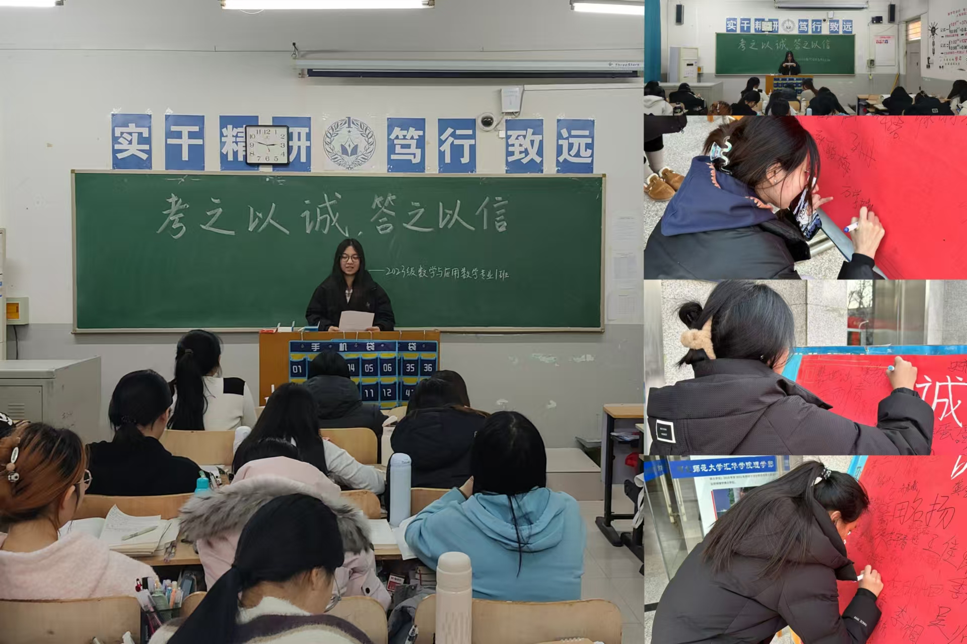 为营造公平诚信的考试环境,让同学们以端正的思想、认真的态度、平和的心态面对考试的检验,树立良好的考风、学风,2023级数学与应用数学1班于2024年12月23日在第二教学楼401教室开展“考之以诚,答之以信”诚信应考活动。