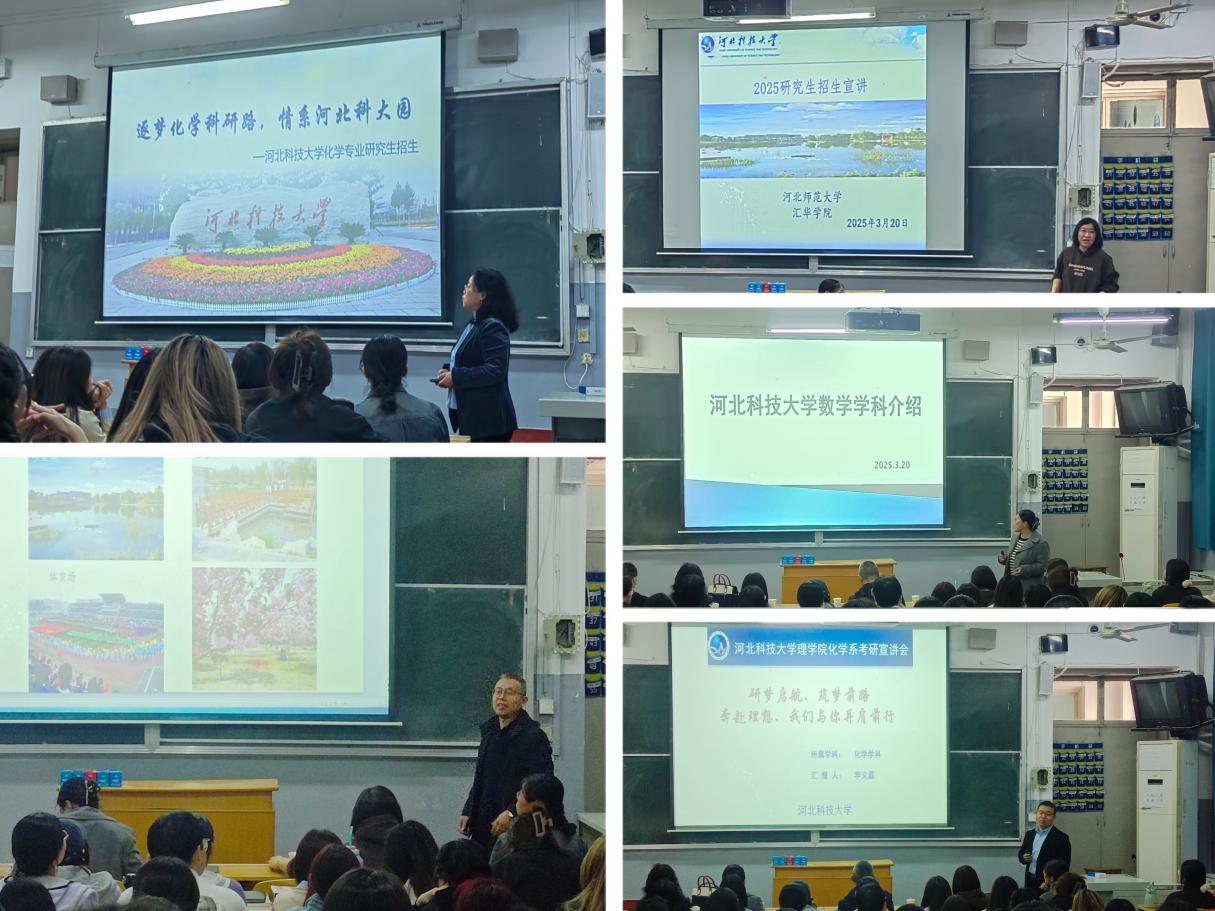 宣讲会上,河北科技大学理学院副院长阎晨光介绍了河北科技大学理学院硕士研究生教育的优势和特色。该院化学系主任赵海燕、化学系副主任李义磊、数学系副主任蔡霞、物理系韩辉云分别对各专业的基本情况、专业发展趋势、学科特点、专业特色、办学实力以及往年招生、培养与就业等内容作了详细说明。