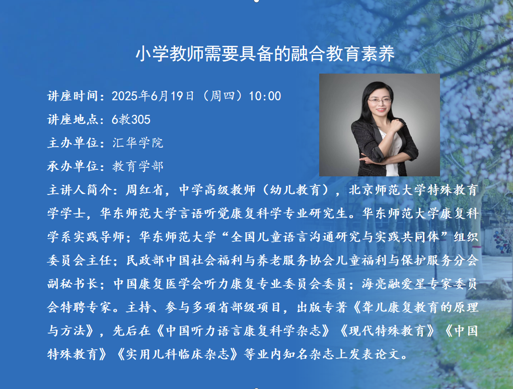 讲座题目:小学教师需要具备的融合教育素养讲座时间:2025年6月19日(周四)10:00讲座地点:6教305主办单位:beat365英国官方网站承办单位:教育学部主 讲 人:周红省主讲人简介:周红省,中学高级教师(幼儿教育),北京师范大学特殊教育学学士,华东师范大学言语听觉康复科学专业研究生。华东师范大学康复科学系实践导师;华东师范大学“全国儿童语言沟通研究与实践共同体”组织委员会主任;华东师范大学“幸福之花孤独症群体庇护性就业研究与实践项目”特聘专家;北京师范大学教育学部校友会上海分会副会长;民政部中国社会福利与养老服务协会儿童福利与保护服务分会副秘书长;中国康复医学会听力康复专业委员会委员;海亮融爱星专家委员会特聘专家;上海小小虎幼稚园(融合教育)首任园长;多所高校客座教授、多所特校名誉校长、多家康复中心名誉主任。浙江省教育厅省培课程《小学教师(资源教师)教育康复技术研修班》负责人。研究领域:特殊需要儿童教育康复的理论与方法,教育康复课程设置和机构管理,特殊需要儿童融合教育,“心青年”庇护性就业。曾主持、参与多项省部级项目,出版专著《聋儿康复教育的原理与方法》,先后在《中国听力语言康复科学杂志》《现代特殊教育》《中国特殊教育》《实用儿科临床杂志》等业内知名杂志上发表《1+ X +Y康复教育模式的实践研究》《生成课程在“1+X+Y”康复教育模式中的实践研究》《渐进式融合教育模式》等论文10余篇。2015年获上海市科技进步二等奖。从事特殊需要儿童康复教育/融合教育/“心青年”庇护性就业的理论及实践研究、师资培训、家长培训30余年,先后在全国31个省份的特教、残联、民政系统的国家级、省级培训班讲课,在80余所高校做学术讲座和大学生创业/创新指导。讲座主要包括6个方面的内容:1、小学教育转型发展面临的困局与挑战2、社交沟通障碍儿童小学融合教育支持策略3、注意力缺陷多动障碍儿童小学融合教育支持策略4、学困儿童小学融合教育支持策略5、情绪行为障碍儿童小学融合教育支持策略6、小学融合教育指导典型案例分享