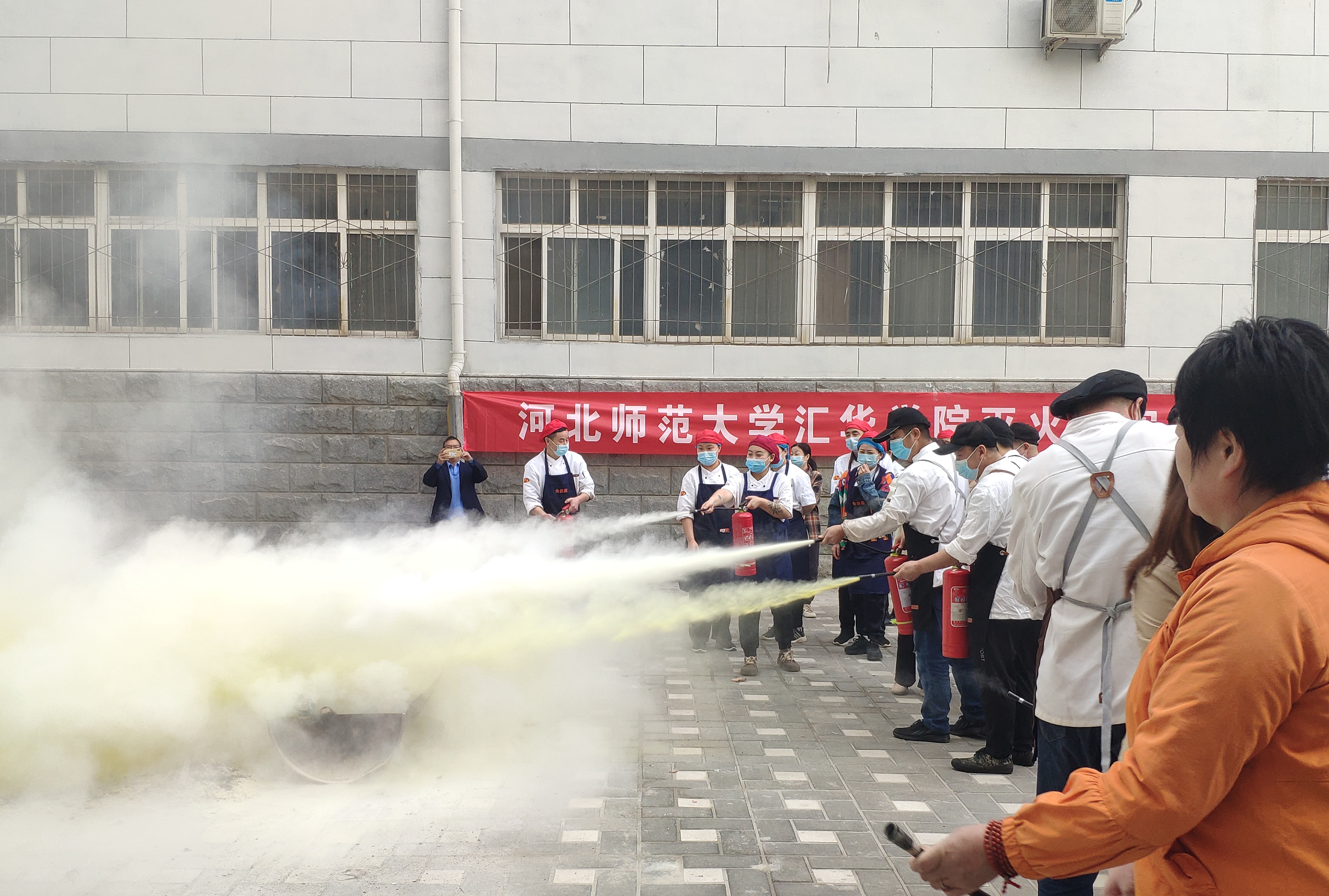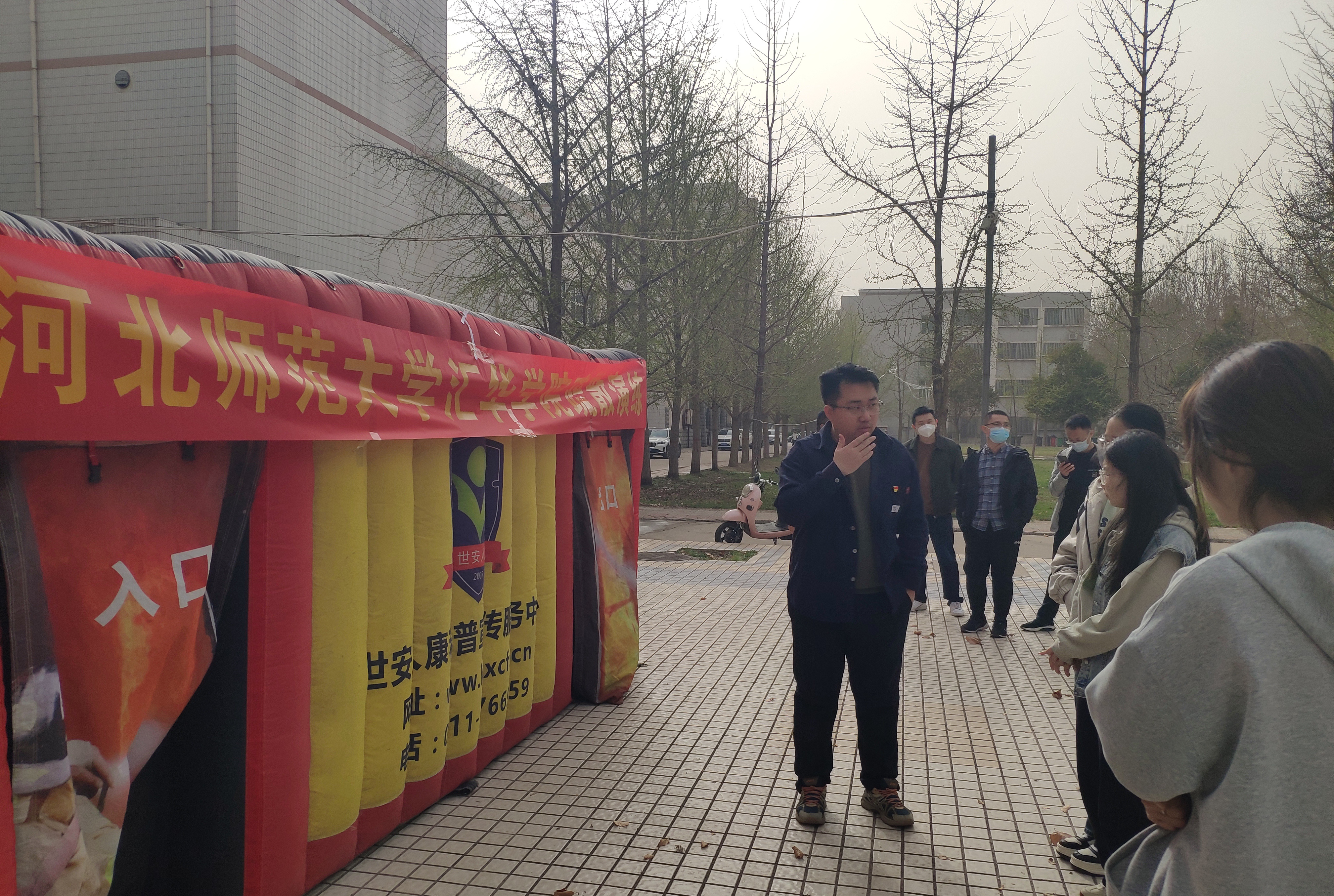 活动中,安全工作处协同各兄弟单位,积极开展消防安全讲座,通过真实案例使广大师生充分认识到火灾危害与校园消防安全的重要性,自觉做校园防火践行者与守护人。针对食堂、学生宿舍、图书馆等防火重点部位,组织工作人员及勤助学生开展灭火器实操与突发火情应急培训,进一步强化了广大师生员工初起火灾扑救及组织疏散逃生能力。在应急疏散演练环节,工作人员通过设置帐篷和烟雾,模拟火灾逃生现场,到场师生按照预定方案有序进入通道,按照火场逃生动作要领,沿安全指示标志有序疏散。