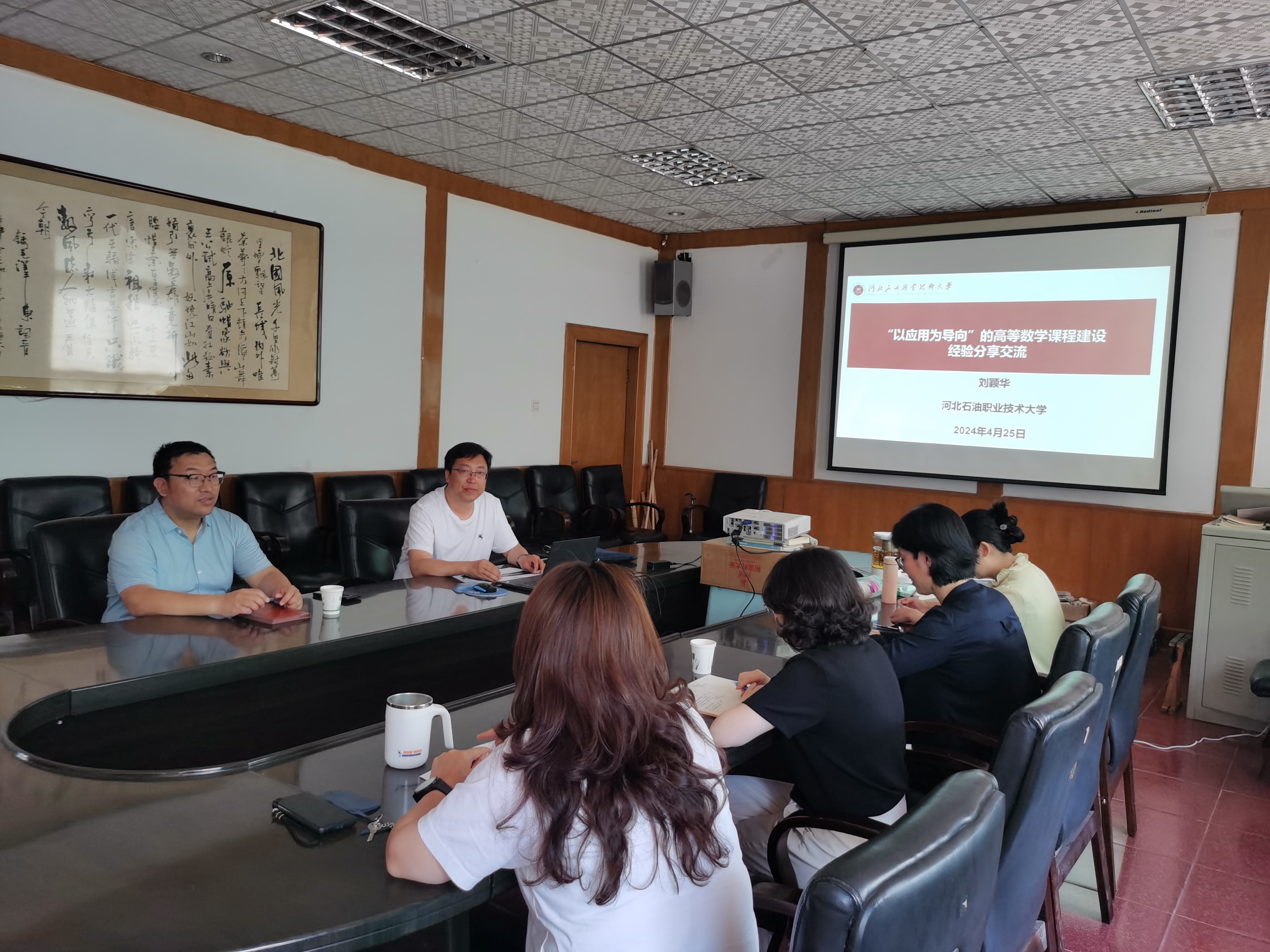 4月26日上午,beat365官网数理教研室教学研讨培训在第二教学楼201会议室举行。活动邀请河北石油职业技术大学数理部主任刘颖华作了题为《以应用为导向,学数学用数学》的报告,并进行了高等数学课程建设经验交流,学院副书记副院长刘献军及《高等数学》课程的任课教师参加,理学部部长王薇主持。