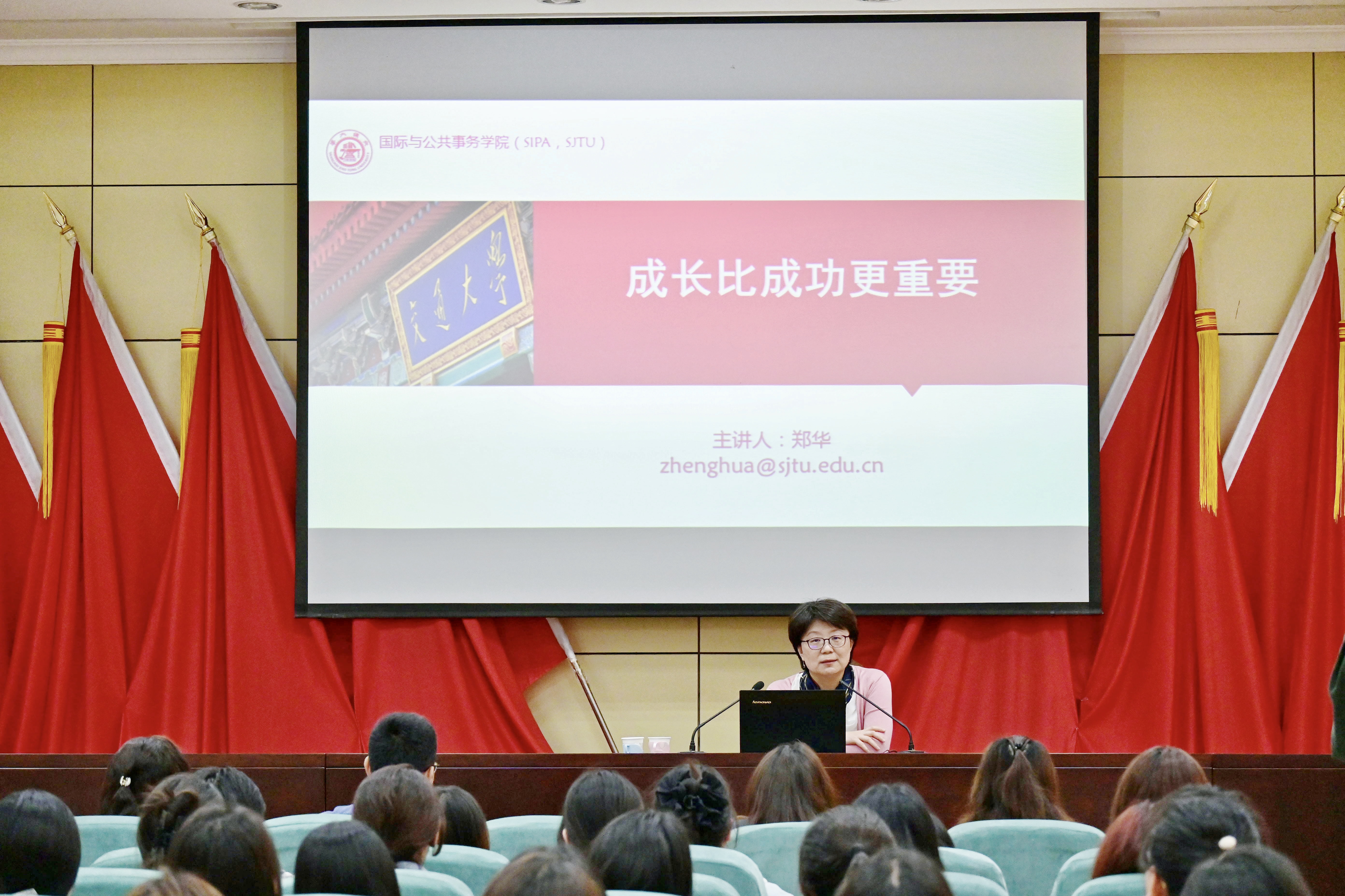 4月28日下午,上海交通大学博士生导师郑华教授应邀到beat365官网,在图书馆一楼报告厅为师生作了题为《成长比成功更重要》学术讲座。外语学部部长孟秋菊主持讲座,外语学部全体教师和英语专业学生聆听报告。