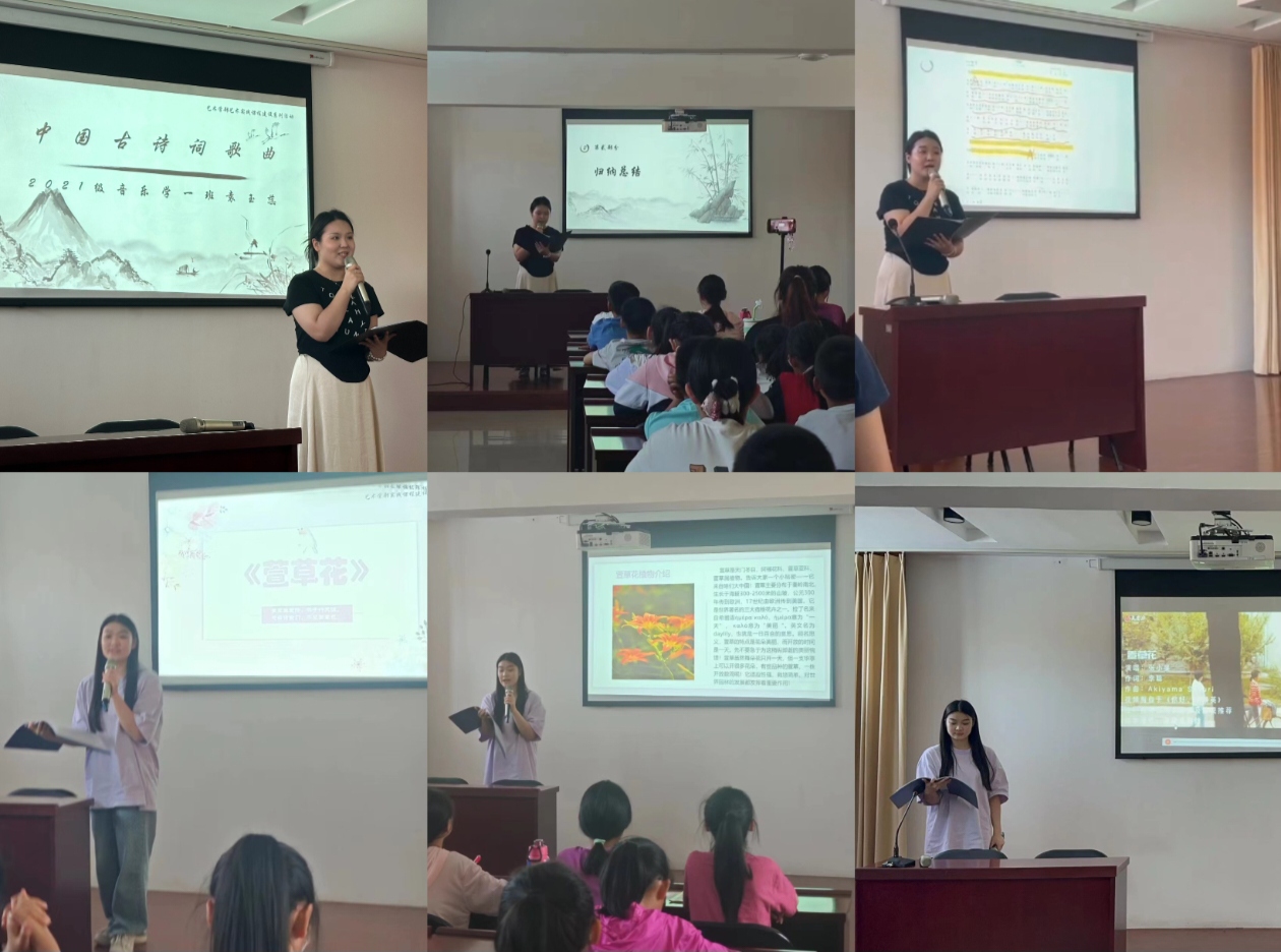 课堂上,袁玉蕊同学开展了关于古诗词歌曲的讲演,以古诗词艺术歌曲《锦瑟》为例,从歌曲赏析、归纳总结、歌曲演唱三个角度和小同学们分享了中国古诗词歌曲的知识。最后通过现场演唱《锦瑟》《青玉案元夕》《虞美人·春花秋月何时了》三首歌曲,激发小同学们对中国古诗词艺术歌曲的热爱,对学习中国传统文化的向往。