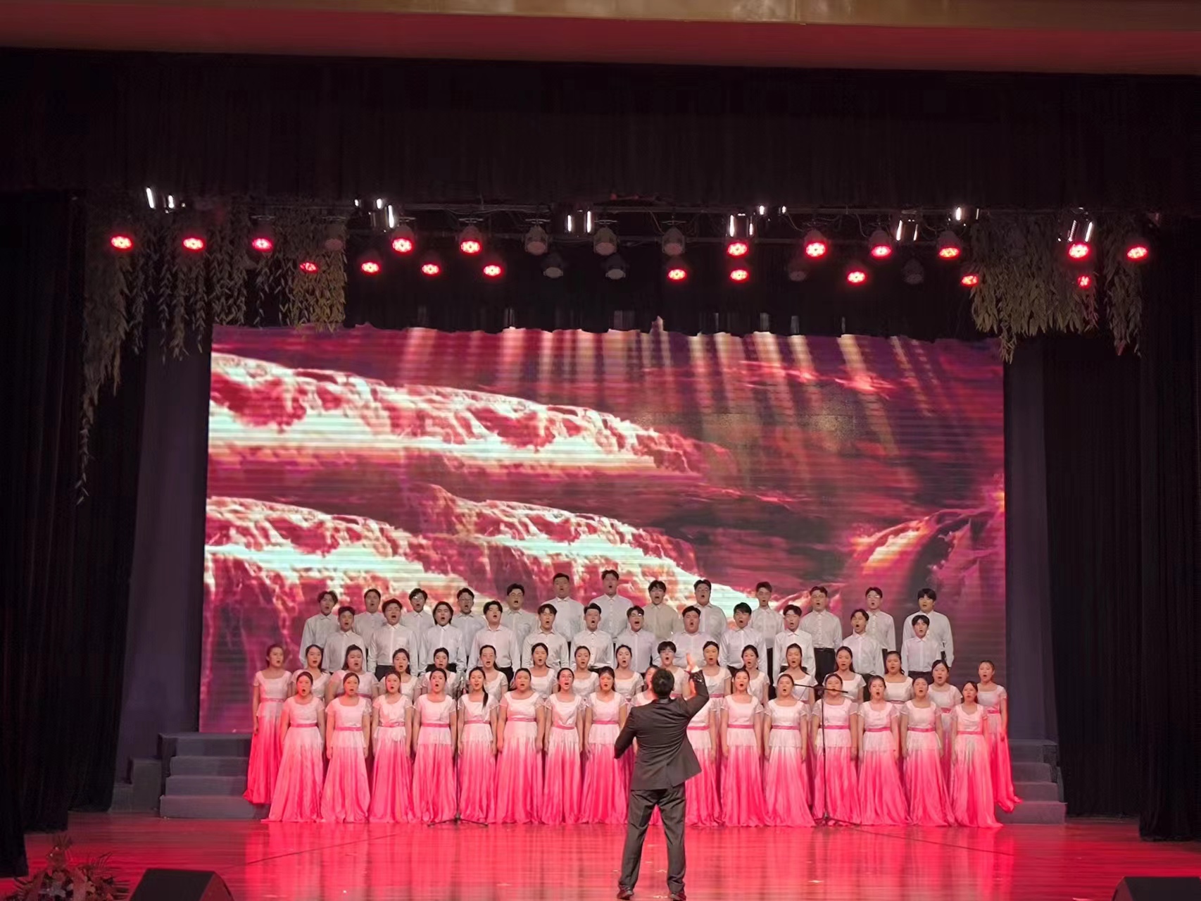 本场音乐会上演了声乐套曲《黄河大合唱》,8个乐章分别是:《黄河船夫曲》《黄河颂》《黄河之水天上来》《黄水谣》《河边对口曲》《黄河怨》《保卫黄河》《怒吼吧,黄河》。整场演出由艺术学部刘斌老师指挥,声乐教师和磬音合唱团共同呈现。本场音乐会曲目丰富、表演形式多样,包含了混声合唱、独唱、轮唱、对唱等形式。整套作品以黄河为背景,热情歌颂中华民族源远流长的光荣历史和中国人民坚强不屈的斗争精神。全团师生克服种种困难,历时8个月排练完成。音乐会的圆满成功,不仅是对教学成果的检验,更是在新的时代呼唤新的青年,明确新的角色,在歌声中感悟信仰的力量,在实践中践行“黄河”精神!演出结束后,徐国强亲切慰问了全体演员,鼓励大家赓续红色血脉,弘扬延安精神,扎实学习专业,继续开展好各类艺术实践!
