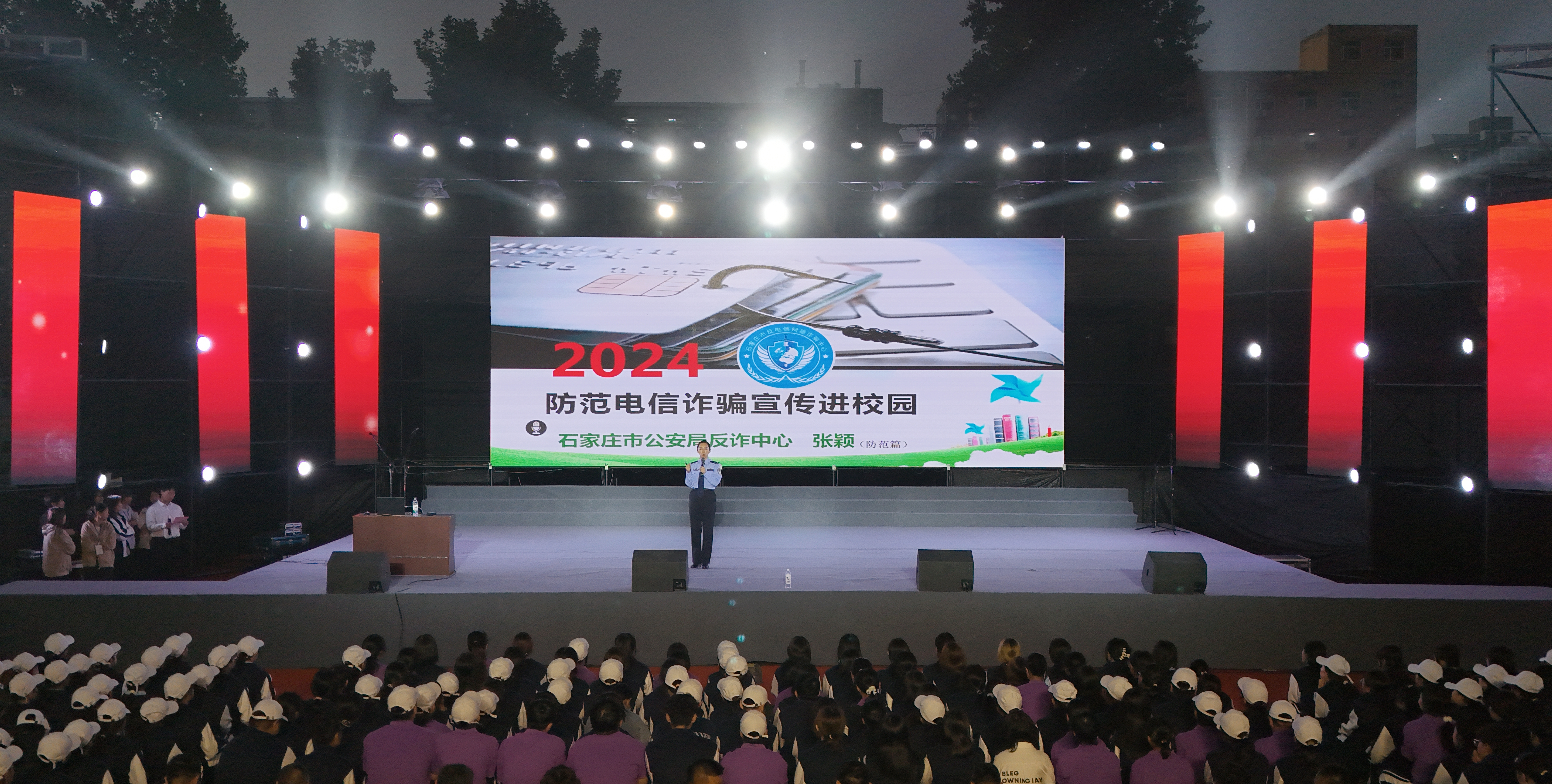 9月23日,beat365官网在运动场开展“创建无诈校园 护航青春成长”反诈宣传进校园活动。学院党委副书记、副院长刘献军,辖区育文派出所所长朱玉磊,石家庄市公安局反诈中心张颖出席本次活动。相关职能部门负责人,2024级新生辅导员和全体新生参加活动。