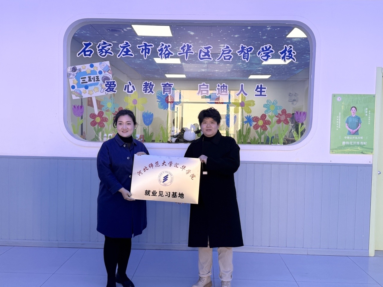 3月28日上午,学院副院长闵杰、招生就业处处长徐鹏、教育学部部长武新慧、学生工作副部长、辅导员一行,赴石家庄市裕华区启智学校举行特殊教育专业“就业见习基地”挂牌仪式。