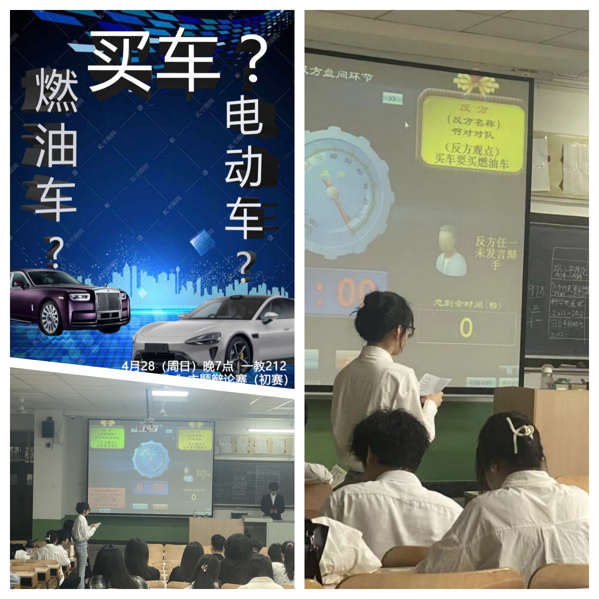 4月28日,工学部汽车爱好者协会在第一教学楼212教室,举办了一场关于“买车应买电动车还是燃油车?”的辩论赛,正反双方围绕这一热门话题展开了激烈的辩论,不仅吸引了同学们的广泛关注,也激发了大家对未来汽车发展趋势的深入思考。