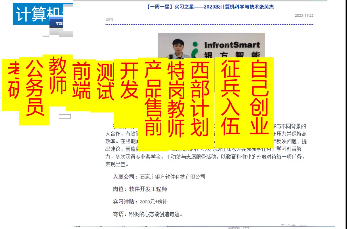 班会伊始,辅导员赵琛通过生动的案例和数据,向同学们展示了计算机行业的就业前景。计算机科学与技术专业在各个领域都发挥着至关重要的作用,从人工智能到大数据分析,从软件开发到网络安全,计算机专业人才的需求持续增长,同学们未来可以选择考研、公务员、教师编、产品售前、前端工程师、测试工程师、开发工程师、西部计划、征兵入伍、特岗教师、自己创业等多个职业方向。但是赵琛也强调,计算机科学与技术专业目前也面临着激烈的竞争,自新冠疫情爆发后至今,各大公司裁员情况有所提升,计算机科学与技术专业的学生就业情况不可避免受到大环境的影响。为了在未来的就业市场中脱颖而出,同学们需要不断提升自己的专业技能和综合素质,在学习过程中,要注重理论与实践相结合,积极参加各类实践项目和竞赛,提高自己的动手能力和解决问题的能力。此外,赵琛还鼓励同学们树立正确的职业价值观,在选择就业方向时,要结合自己的兴趣爱好和特长,找到最适合自己的发展道路。同时,要保持积极进取的心态,勇于面对挑战和困难,不断追求卓越。