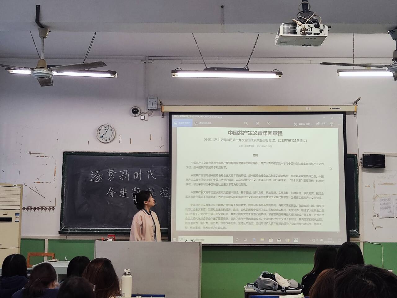 回望团史光辉,践行青春誓言 为了加深对共青团历史的了解,班会还特别设置了“回望团史光辉”环节。在李智贤的引导下,同学们观看了共青团历史纪录片,聆听了团内先进事迹的分享,被一代代共青团员为国家和人民无私奉献的精神所深深打动。班长张帅康同学代表全班同学发言:“作为新时代的共青团员,我们要继承和发扬共青团的优良传统,铭记历史使命,用实际行动践行‘请党放心,强国有我’的青春誓言。”