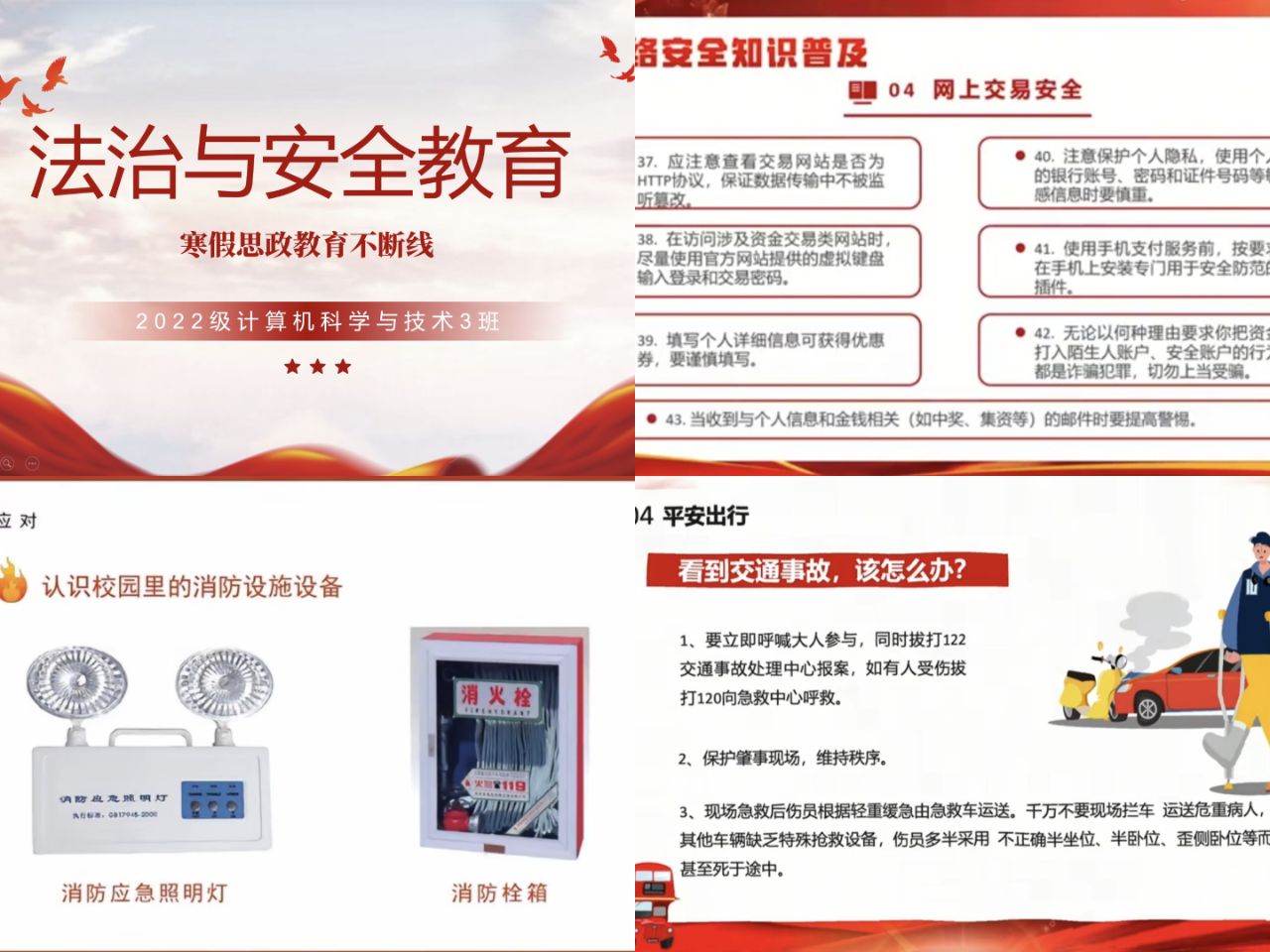 为深入贯彻落实法治教育精神,增强学生的法治观念和安全防范意识, 2022级计算机科学与技术3班开展了“法治教育和安全防范” 寒假思政教育不断线活动。本次活动以普及法律法规知识为核心,涵盖网络安全法、治安管理处罚法等多方面内容,旨在为学生提供全面的法治教育和安全防范知识,让学生了解并掌握相关的法律法规知识,提高自我保护能力,确保度过一个安全、有意义的寒假。