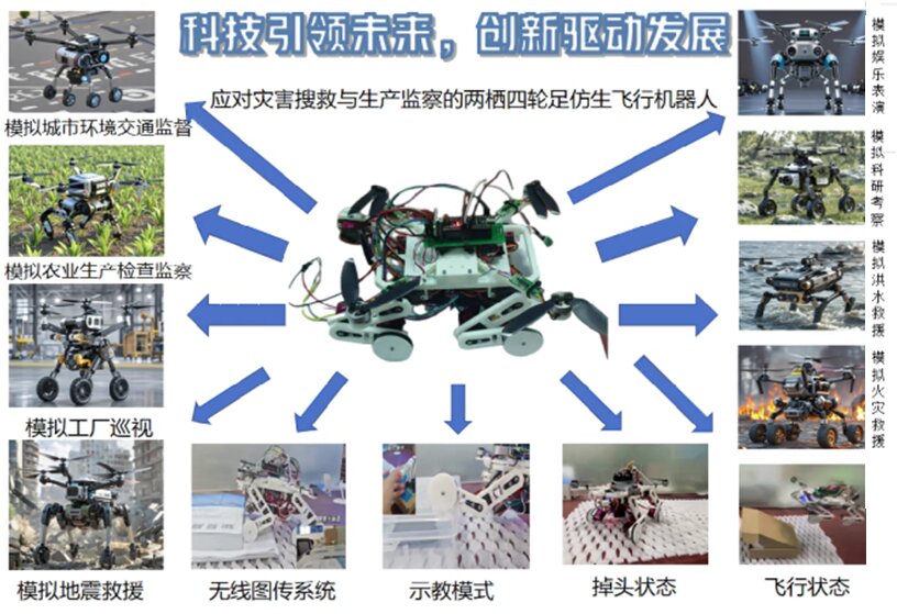 在本届大赛中,工学部代表队参加了“人工智能与机器人创意设计赛”赛道,学部对此高度重视,给予全方位支持,并选派魏娜娣、王一凡两位教师担任竞赛指导老师。在团队配合下,顺利完成了《应对灾害搜救与生产监察的两栖四轮足仿生飞行机器人》作品创作。该作品不仅包含了机器人实物,还配备了详细的论文、讲稿、设计材料以及展示视频等丰富内容。作品通过现场答辩演示和评委提问评价的方式进行了参赛评比。这款新型机器人融合了四足行走与飞行功能,旨在突破现有机器人在环境适应性方面的限制。通过巧妙结合飞行装置与轮足结构,机器人对复杂环境的适应能力得到了极大提升,实现了地面与空中双重移动方式的完美融合。它集轮式驱动、足式驱动、混合驱动以及四旋翼飞行功能于一体,能够适应各种极端环境,并具备四足行走、轮动、混合驱动和飞行四种运动模式。本作品的独特结构设计、先进的感知与运动控制算法以及广泛的多场景应用能力,构成了其最大的创新亮点。机器人能够根据不同地形灵活切换运动模式,从而在一定程度上提高自然灾害和生产安全挑战中的搜救效率,减少人员伤亡,并增强生产安全监督能力。