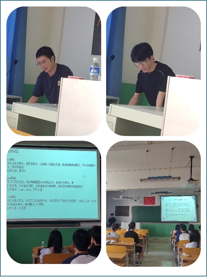 会上,两位主讲人结合自身经历,围绕竞赛题型分析、算法思维训练、团队协作技巧以及临场应变策略等方面进行了详细讲解。他们分享了平时的刷题技巧,还介绍了如何在有限时间内高效解题、合理分工,并鼓励同学们多参与实战演练,提升编程能力与心理素质。此外,他们还向在场同学推荐了多个实用的学习资源和训练平台,如LeetCode、洛谷网、蓝桥杯训练系统等,并建议低年级同学尽早打牢基础,积极参与校内外各类算法竞赛,积累经验、拓宽视野。