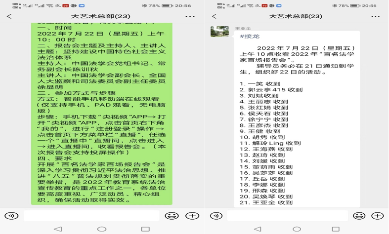 艺术学部在接到《关于收看2022年“百名法学家百场报告会”法治宣传活动和国家机关专场报告会的通知》后,紧急召开学部党总支会议,统一思想,即为深入学习贯彻习近平法治思想,中国法学会举办2022年“百名法学家百场报告会”法治宣讲活动和国家机关专场报告会,请全体师生员工按时收看;开展“百名法学家百场报告会”是深入学习贯彻习近平法治思想、推进“八五”普法规划贯彻落实的重要举措,是2022年教育系统法治宣传教育的重点工作之一,各单位要高度重视、广泛动员、精心组织,确保活动取得实效。同时,党总支委员分头通知专任教师,并要求辅导员连夜各自采取不同方式传达给所带在校生。