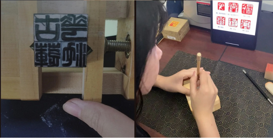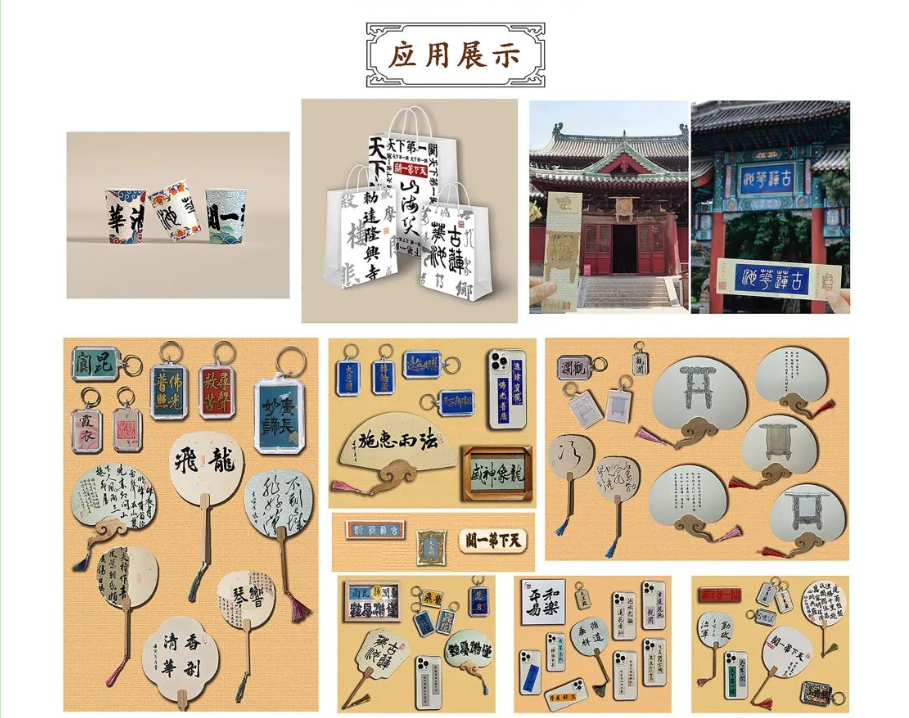 为期十天的实践不仅让队员们对古建筑牌匾文化有了更深一步的认识,更是提供了理论学习付诸于实践的机会,增强了创新意识,队员们运用自己的专业知识为推广古建筑和牌匾文化贡献自己的力量。此次实践完成以牌匾内容为素材绘制团扇16个,钥匙扣26枚、手机壳16个、书法创作4件、篆刻古牌匾风格印章6方。以牌匾形式为依据,设计插画7张、纸袋包装3个、纸杯包装3个、书签4套、冰箱贴3枚。