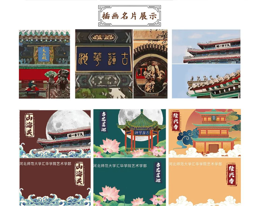 7月1日,是艺术学部河北省古建筑牌匾文化宣传队进行集中实践的最后一天,今天队员们线上开会对石家庄市正定隆兴寺、秦皇岛市山海关以及保定市古莲花池古建筑景区牌匾文化的周边作品进行创作总结。付一航通过文字排版与设计,制作成与天下第一关和古莲花池牌匾文化相关的手提纸袋,并贴图到样机中展示成品。崔欣雨提取牌匾中的元素,制作成天下第一关,隆兴寺和古莲花池牌匾相关的纸杯,并贴图到样机中展示成品。芦丁铖通过ps绘制插画,对天下第一关,隆兴寺,古莲花池进行手绘创作。路淑淇提取碑刻和牌匾中的元素,进行了临摹,分别写了扇面,钥匙扣和装饰画。刘红旭字体取于牌匾,制成钥匙扣,誊写的楹联可以起到装饰手机壳的作用。高嘉根据隆兴寺的相关碑刻进行学校名称的创作。赵晴雨将白描手法运用到牌匾上制出扇面并题字,体验古牌匾文化的魅力。至此艺术学部河北古建筑牌匾文化宣传队的集中实践部分基本结束。
