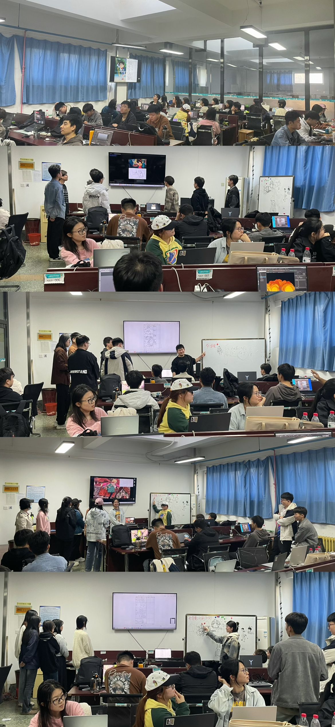 活动分为两个板块,同学们首先观看动画影片《海的侦探》,接着自由分为4个学习小组,选一人为组长。观看完毕,各小组成员轮流走上讲台结合《海的侦探》分镜头来分析当前阶段正在学习的动画分镜头脚本设计内容,接着讲评了同学们的分镜头脚本设计作业,其他小组成员认真聆听并提出不同意见。