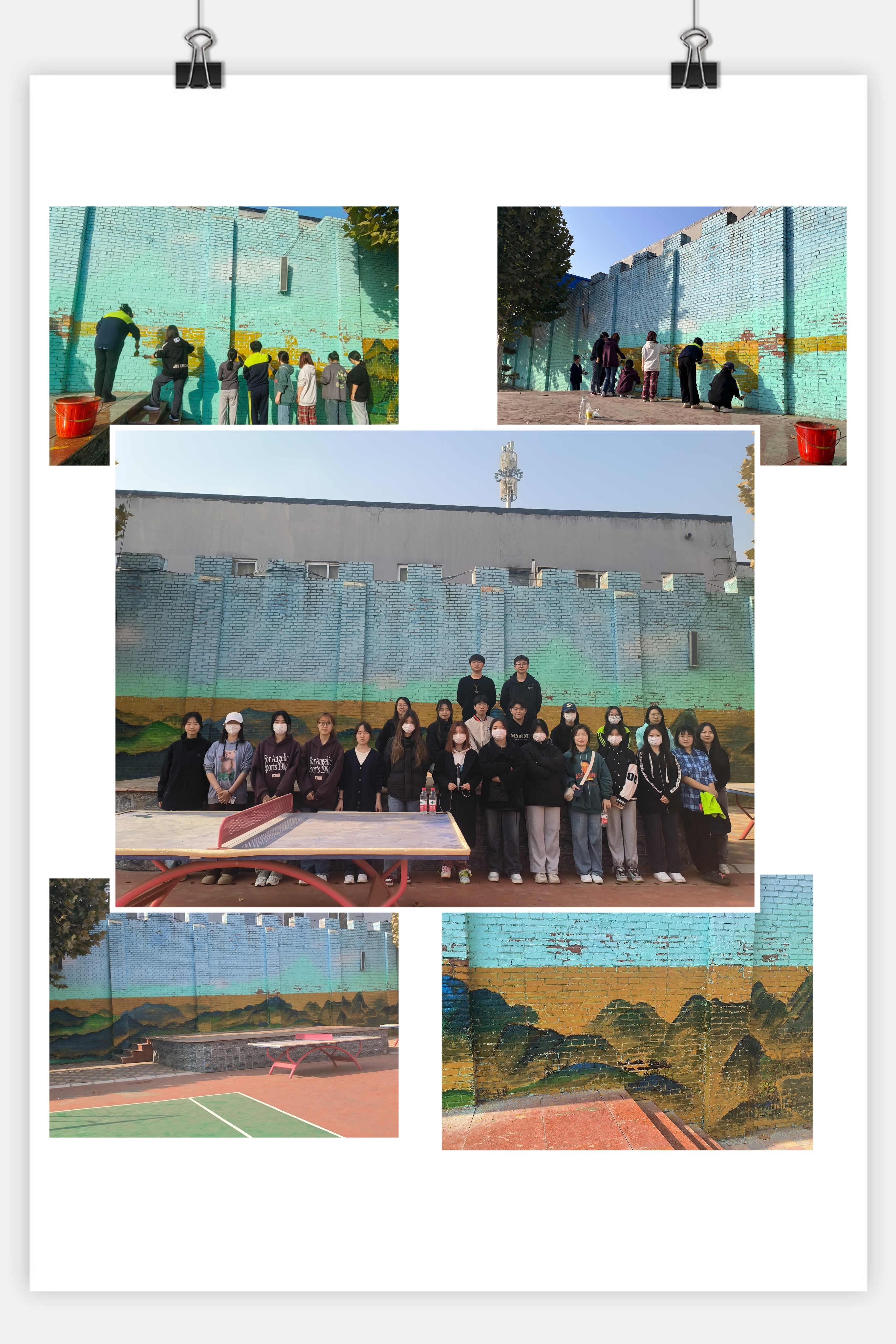在墙绘活动绘制期间,同学们以墙为卷、以丙烯画笔为材料,一笔一笔细心勾勒,刷底色、起型、刷浅色、上深色、收型、画细节,同学们利用自身专业的优势,积极参与其中,让一面墙焕发出了具有中国传统山水画的意境与生机,彰显出了中国文化与审美自信,顺利完成了本次墙绘志愿活动。
