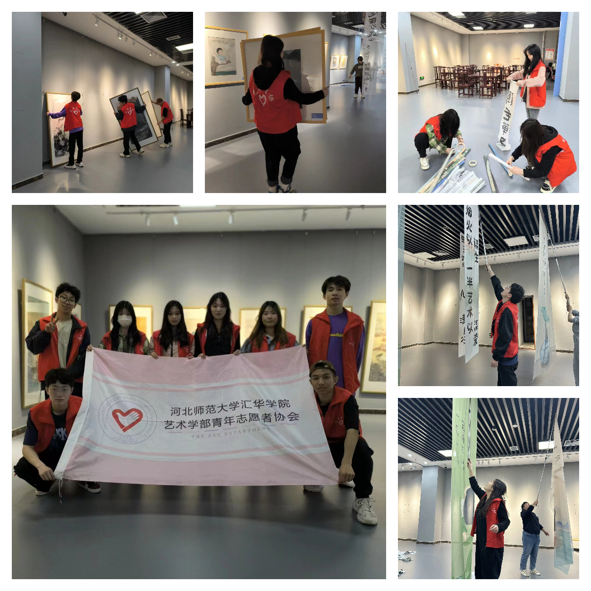 志愿者们到达现场后,河北省群众艺术馆负责人对参与活动的志愿者们进行简单培训和工作分配,志愿者们身着统一服装,以饱满的精神状态开展服务工作。同学们分工明确,使复杂的工作变的简单起来,有负责搬运画作的,有为画作粘贴名牌的,还有负责安装挂钩、装挂作品的。每位志愿者都全身心的融入进自己负责的工作中。下午一点半,志愿者们乘车安全返回学校,活动圆满完成。
