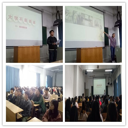 冯时同学的宣讲主题是:“大学不是说说”,他通过清华大学校长的名言:“一个人的知识,通过学习可以得到;一个人的成长,必须通过磨练”引出“爱上杰出的自己”、“自我服务”、“先锋带头作用”、“不忘初心”等主要观点。用幽默的案例将自己肩负的责任及认真对待学业的态度感染在场同学,号召大家明确职责,懂得努力和付出。