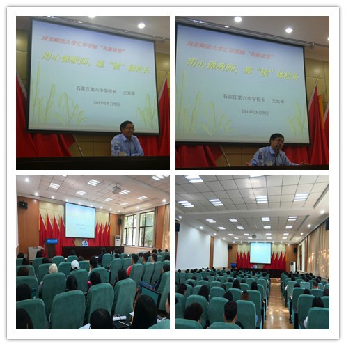 5月9日,石家庄第六中学校长王宪军做客名家讲堂,举办以“用心做教师,用镜做校长”的师德专题讲座。艺术学部部长秦笑笑、副部长刘媛,及学部2016级、2017级全体师范生300余人聆听了讲座。